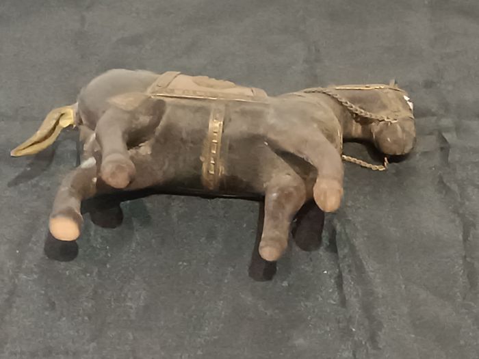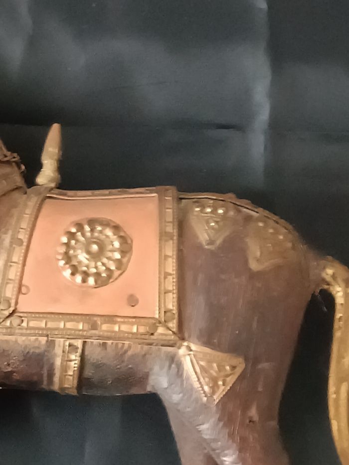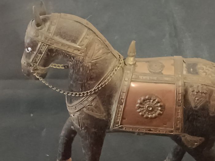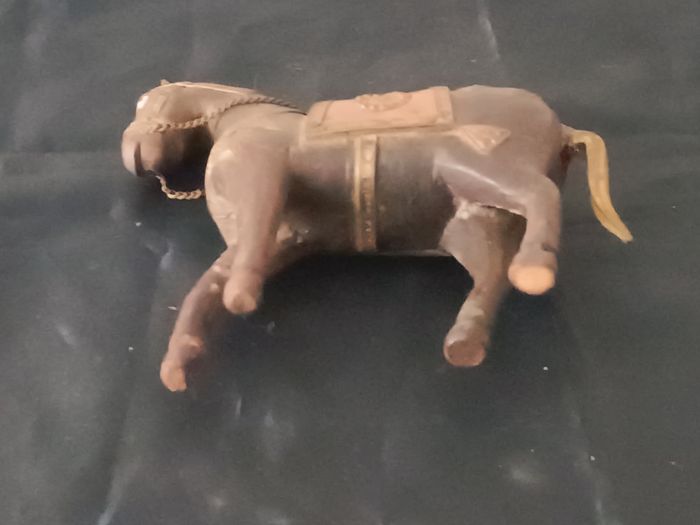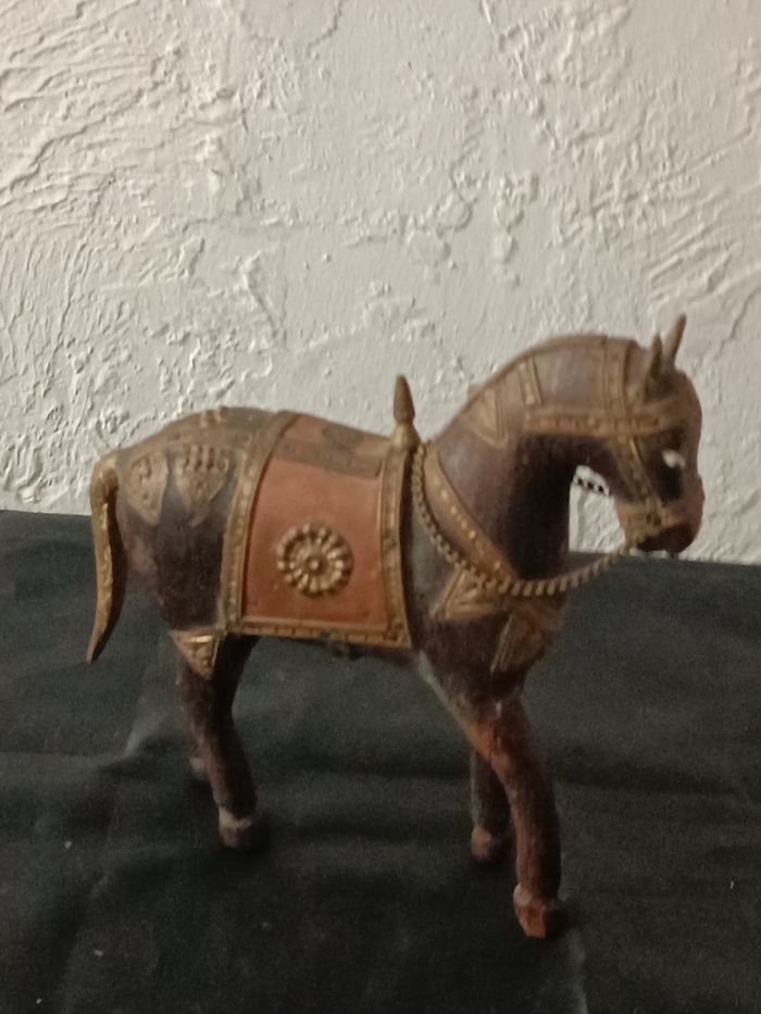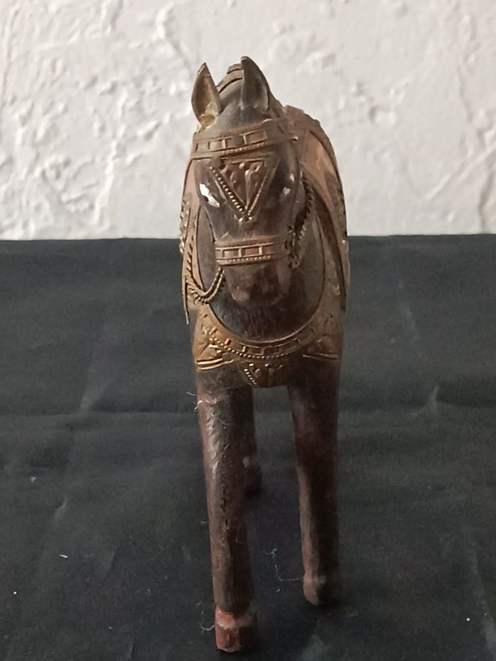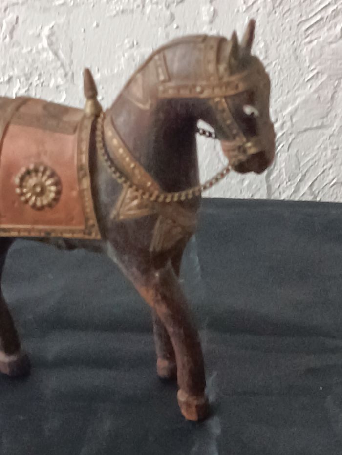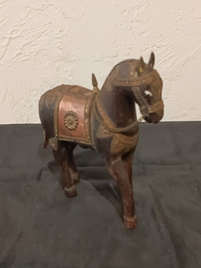 Statuette cheval Marwari en bois sculpté et métal laiton et cuivre 16 cm x 13 cm bon état cf photos