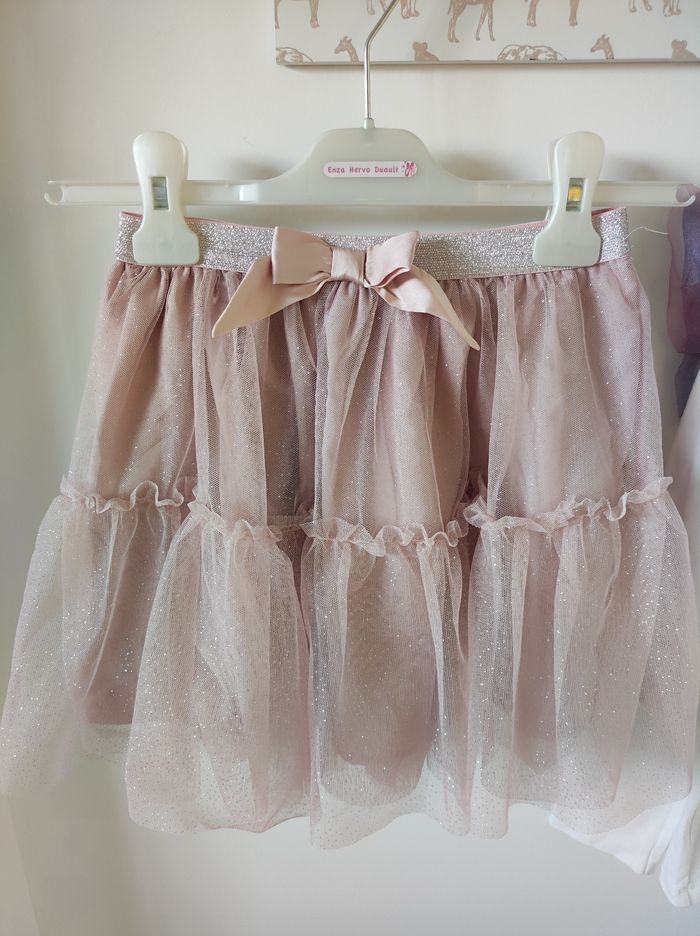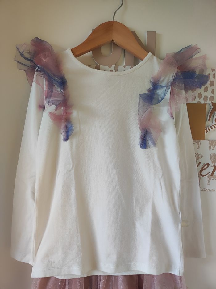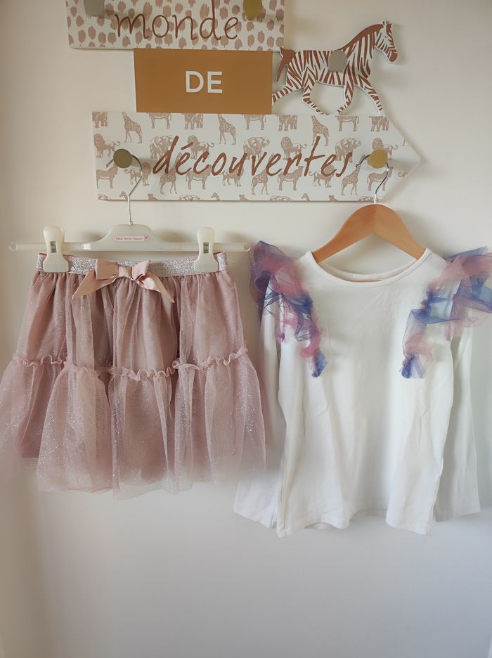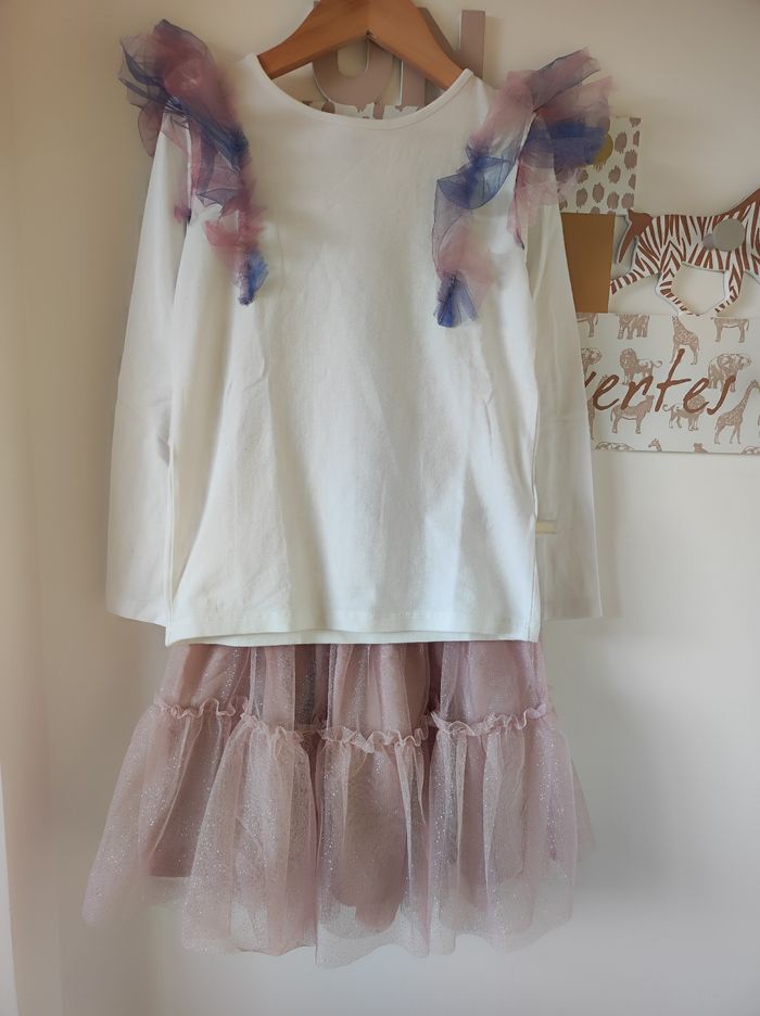 Ensemble composé : - tee shirt manches longues blanc avec des froufrou en tulle rose et violet - jupe en tulle vieux rose avec des paillettes Marque H&M Taille 6-8 ans