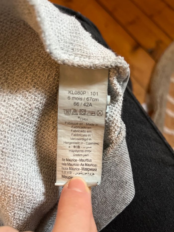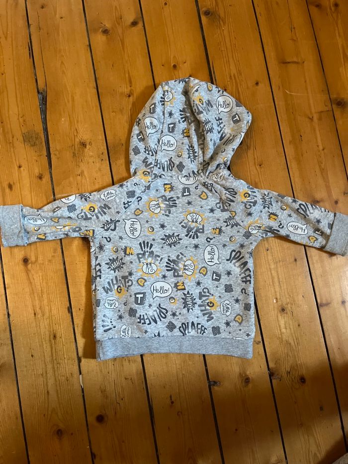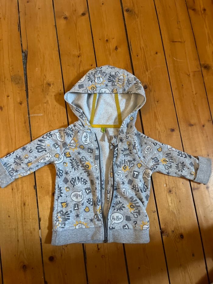 Je vends ce gilet avec des motifs style bande dessiné 🙂 Je ne connais pas la marque, désolée :( La Taille : 6 mois N’hésitez pas si vous souhaitez d’autres renseignements:)