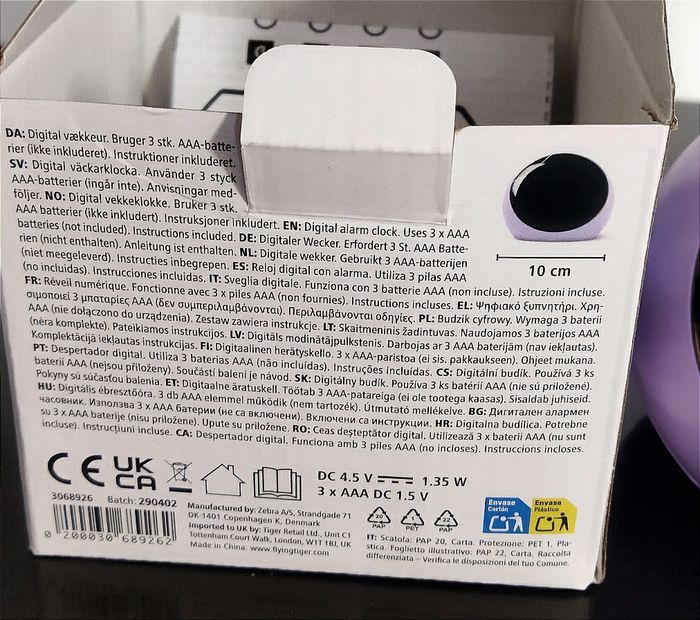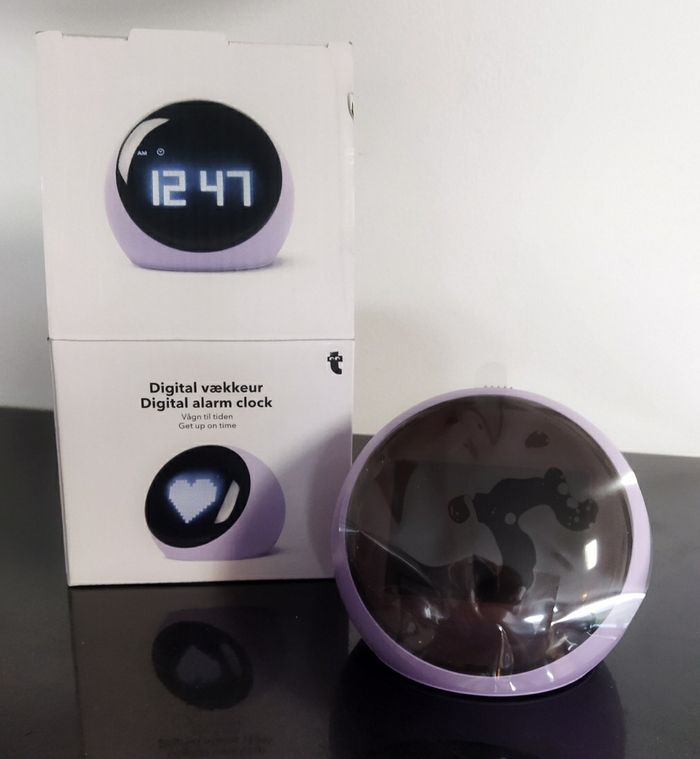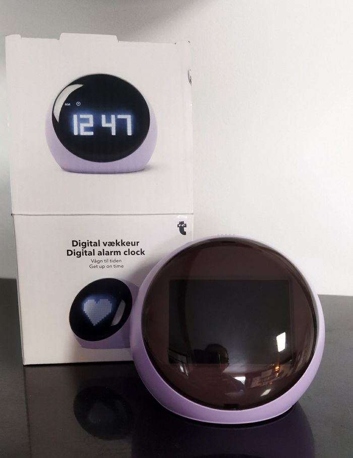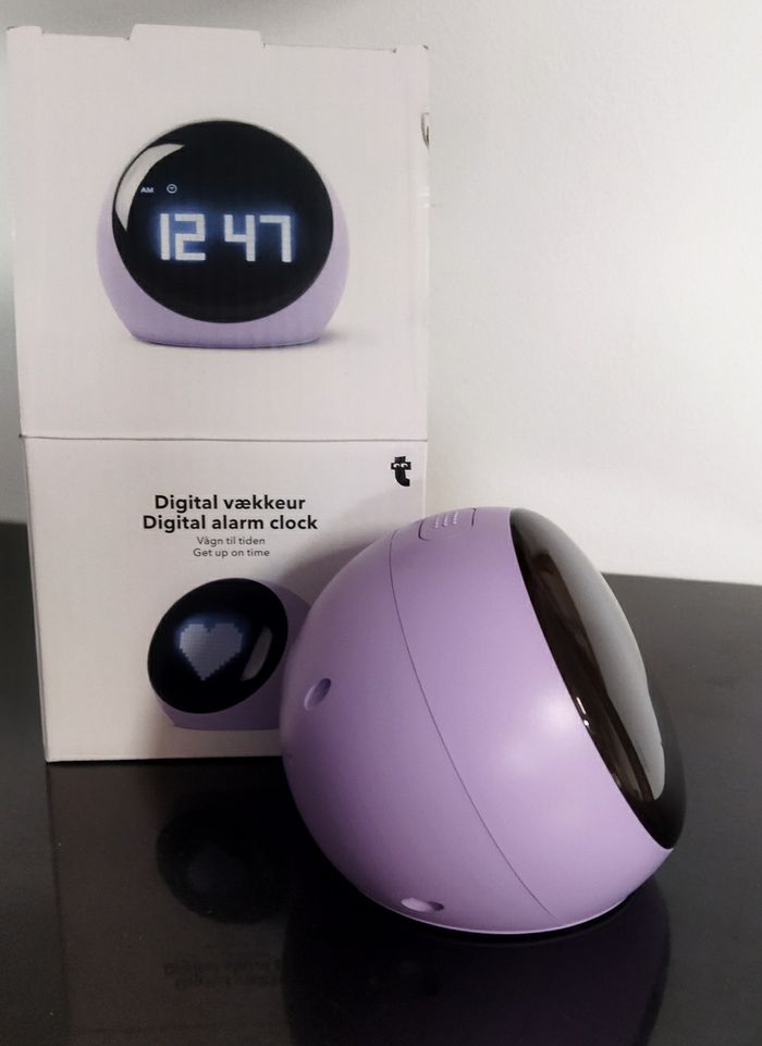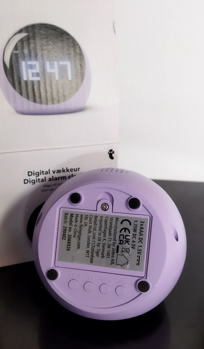 Réveil neuf. S'allume quand on appuie dessus, il n'y a donc pas de consommation de piles continue et pas de lumière la nuit pour bien dormir. Cadeau qui ne plaît pas. Juste déballé. Ce programme avec les boutons sur le dessous, fonctionne avec trois piles