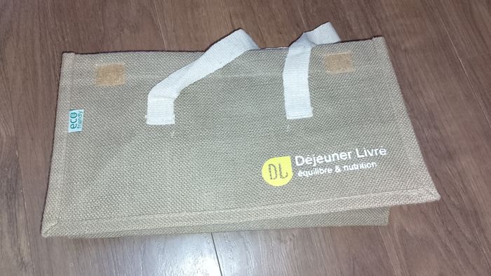 Sac, sacoche, panier de transport refermable en toile de jute intérieur plastifié 36X17 cm H.18 cm inscrit "déjeuner livré équilibré & nutrition" 6 de dispo 10 euro pièce 55€ le lot