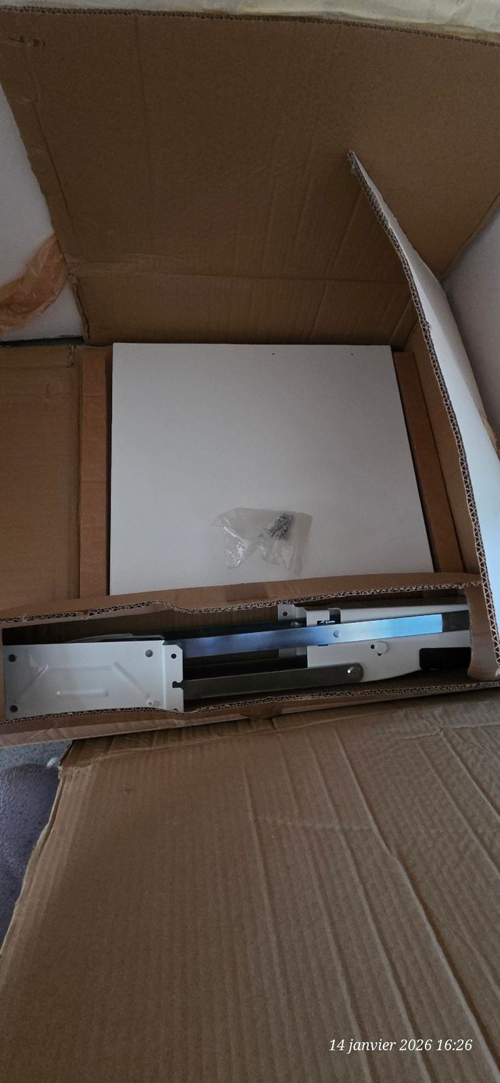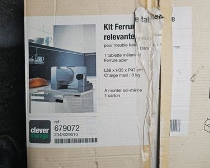Je vends ce kit de fixation pour tablette relevable de la marque Clever Storage. Idéal pour installer une tablette escamotable dans un meuble bas de cuisine, parfait pour poser un robot, petit électroménager ou optimiser l’espace 🏡🤍 🔧 Caractéristiques : • Marque : Clever Storage • Référence : 679072 • Dimensions : L 56 x H 35 x P 47 cm • Charge maximale : 8 kg • Inclus : tablette mélaminée + ferrure acier + carton d’origine • État : Neuf, jamais utilisé Parfait pour gagner en confort et organisation en cuisine ✨ 🚚 Expédition rapide et soignée sous 24h max ✨