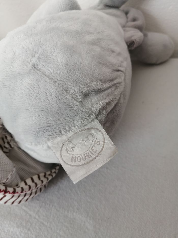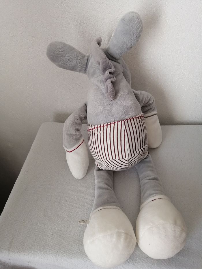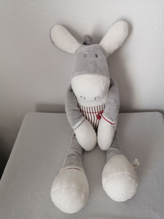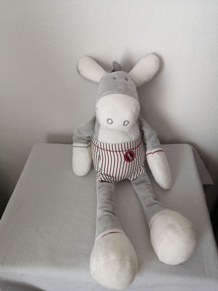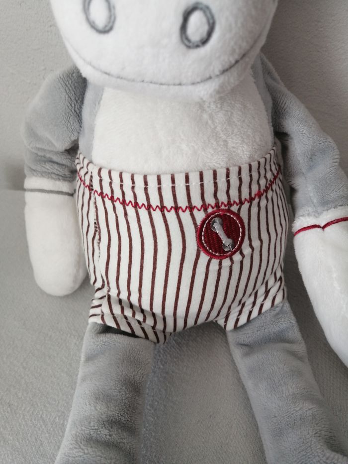 peluche âne paco avec son short en tissus à rayures bordeaux 38 cm noukie's