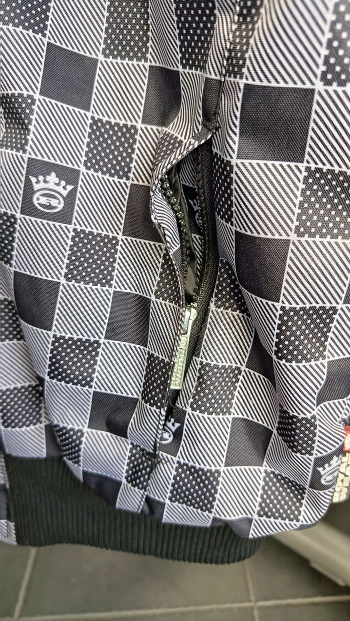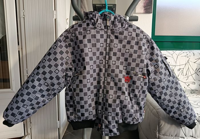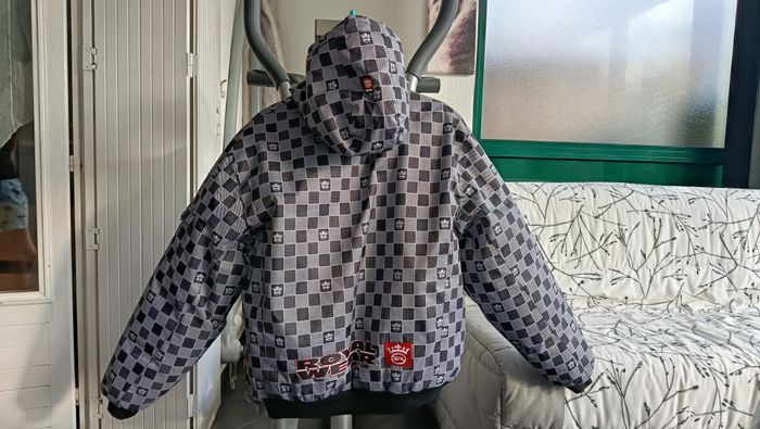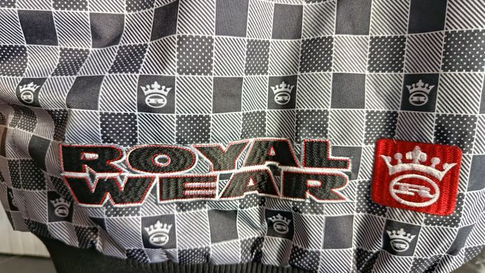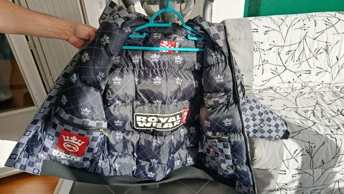 Blouson Royal Wear. Gris et noir. Taille L. Marque emblématique des années 2000. Pièce vintage, introuvable, de très grande qualité. Malgré ces presque 25 ans, l'article est d'une qualité et d'un état irréprochable. Très épais et chaud, hyper imperméable. Capuche, 2 poches sur les côtés avec zip, 1 poche bras gauche, 3 poches intérieures. Mesures: épaules: 54cm, largeur(aisselles): 61cm, longueur: 68cm