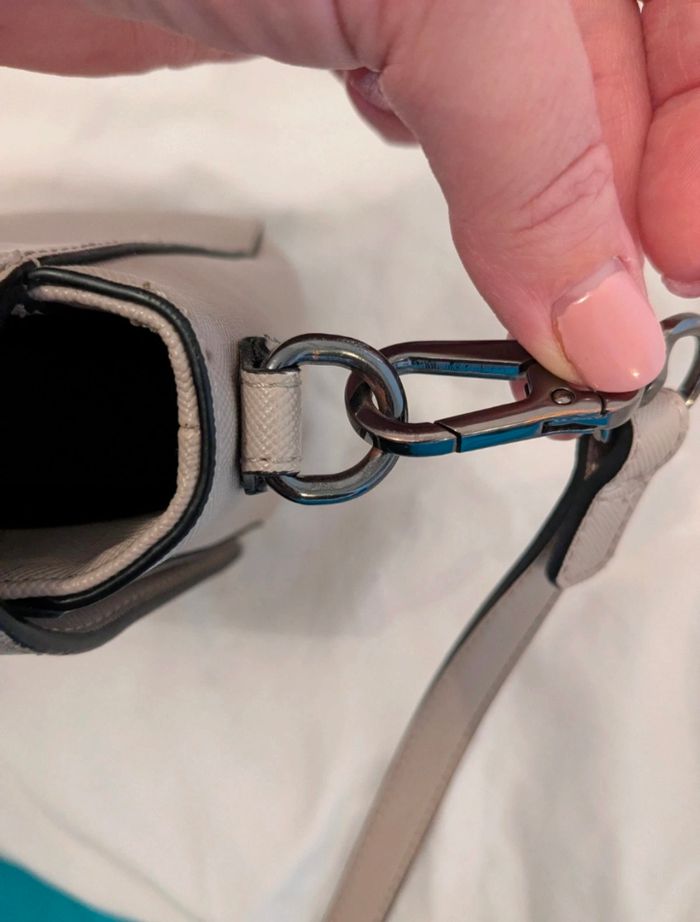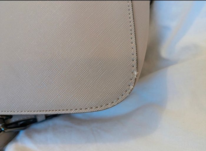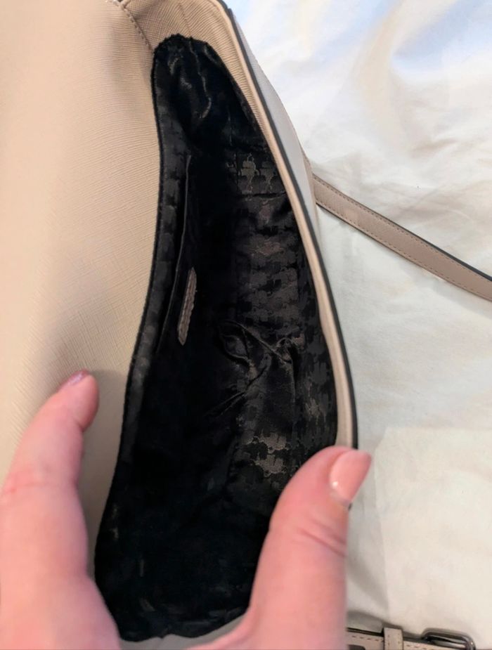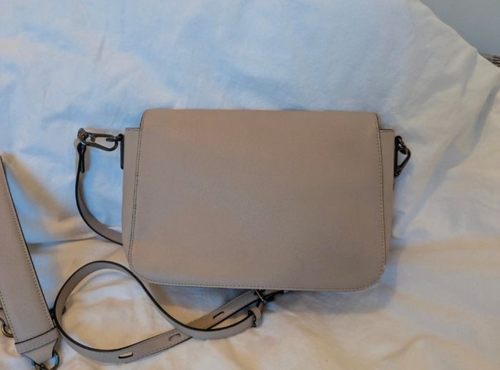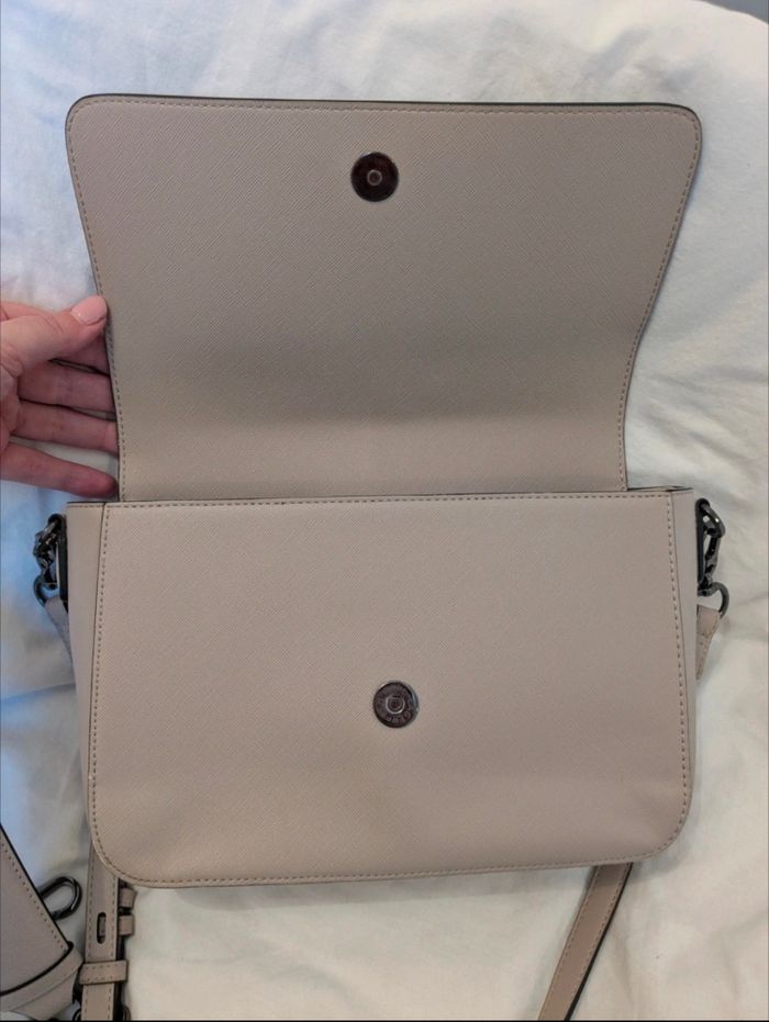 Sac en bandoulière Karl Lagerfeld. Une deuxième lanière pour le porter à la main. Très peu servi. Il y a tout de même un petit accro sur un bord et une légère trace de frottement au niveau des attaches(voir photo). Sinon il est en parfait état.
