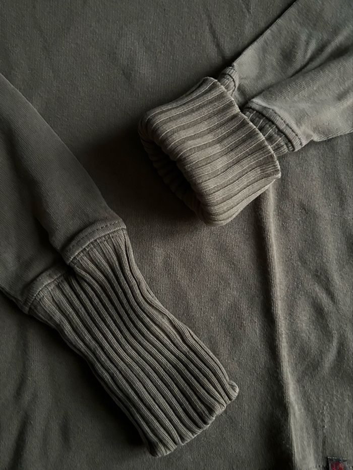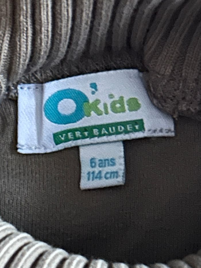sous-pull original de la marque « Okid’s » (Vertbaudet) pour fille. Taille 6 ans. Couleur kaki. Cou et poignée côtelé, pour un effet pull. En très bon état.