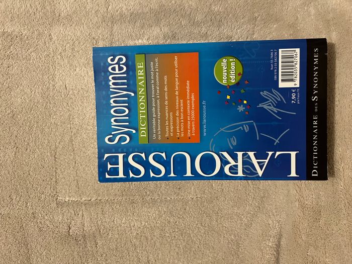 Livre – Larousse – Dictionnaire des synonymes 📖 Référence / Langue française Résumé : Ce dictionnaire des synonymes Larousse est un outil pratique pour enrichir son vocabulaire et améliorer ses écrits. Il propose de nombreux synonymes classés de manière claire, avec des nuances de sens selon le contexte. Idéal pour les élèves, étudiants, écrivains ou toute personne aimant jouer avec les mots. Genre : Référence / Langue française 📏 Merci de bien vérifier les informations et l’état à l’aide des photos, pour éviter toute mauvaise surprise. 👉 N'hésitez pas à regarder mes autres annonces pour grouper vos achats 😉 Une réduction automatique est appliquée pour les lots. Je n'accepte donc pas d'offres supplémentaires sur les articles bénéficiant déjà d'une remise.