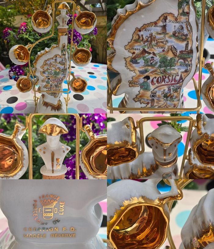 🌟 Superbe ensemble en porcelaine – Carte de Corse & Napoléon 🌟 Objet vintage rare et décoratif, idéal pour collectionneurs ou amateurs de belles pièces ! Je mets en vente ce magnifique service en porcelaine de luxe, composé de : - La bouteille en forme de Carte de Corse, décor coloré - Le bouchon représentant Napoléon - Les 6 tasses assorties, toutes en parfait état - Le support métallique doré d’origine ✨ Fabrication française – Création F.D. – Modèle réservé Un bel objet de collection, typique des années vintage, difficile à trouver complet. 💶 Prix : 40 € (Ensemble complet, état impeccable, idéal pour déco ou collection.) 📍 Remise en main propre Disponible autour de Lognes / Torcy (77).