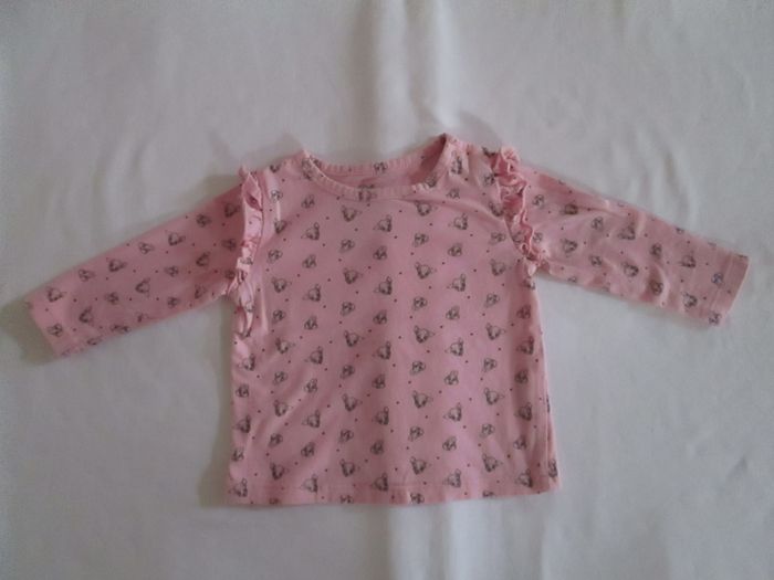 Vends tee-shirt Disney rose. Petits motifs personnages de Bambi. Boutons pression sur l'épaule. Manches longues. Petits volants en haut des bras. 100 % coton. Taille 6 mois. Très bon état. Pour plus de choix, allez consulter mes autres annonces.