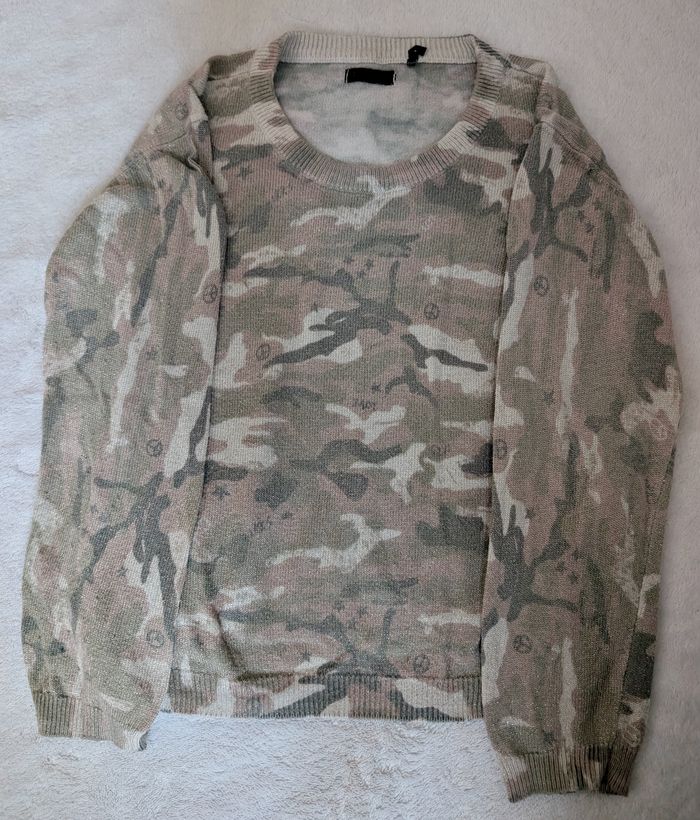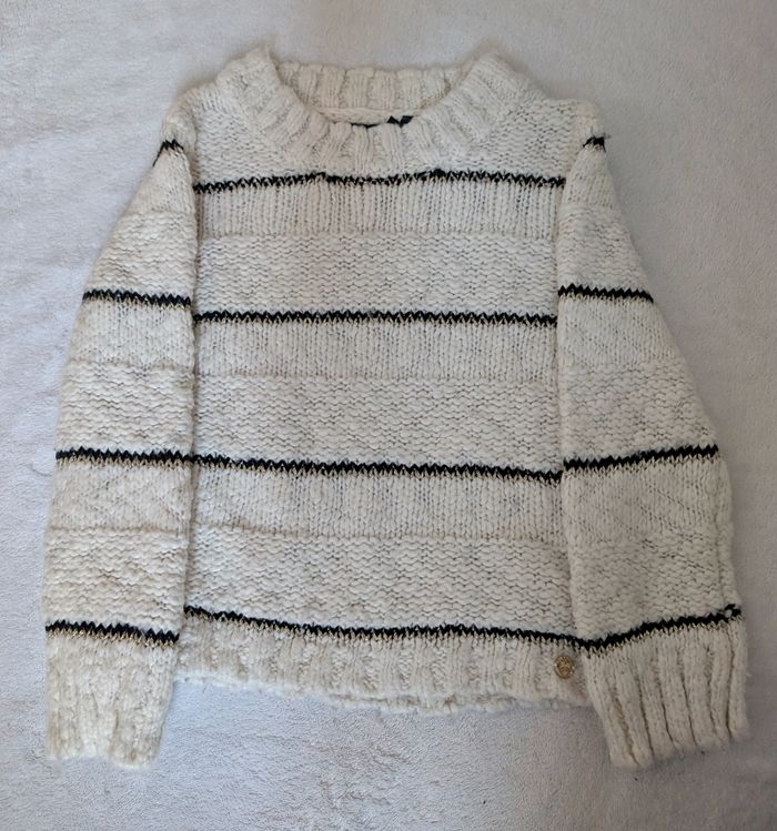 Lot de 2 pulls IKKS : Pull camouflage – étiquette 6 ans → Taille équivalente à un 5/6 ans → Beaucoup porté → Effet légèrement brillant → Bouloches présentes, liées à l’usage → Reste portable Pull écru avec détails fils dorés – étiquette 5 ans → Taille équivalente au pull camouflage → Bon état général → Maille épaisse Les deux pulls ont une taille similaire une fois posés ensemble. 📦 Envoi soigné 🚭 Maison non-fumeur