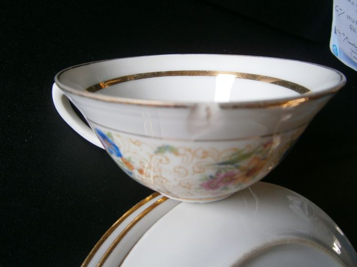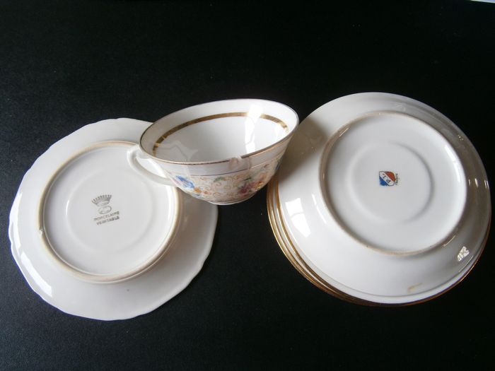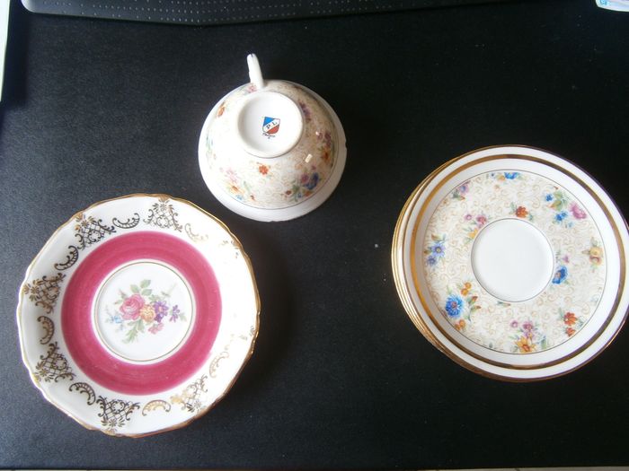 Je n'ai plus les tasses mais les sous-tasses peuvent faire de très jolies assiettes. En porcelaine. Peuvent servir pour la dinette. Lot composé de - 5 assiettes motif "fleurs" avec liseré doré à l'or fin. - 1 assiette différente avec "fleur" et contour rouge et liseré doré à l'or fin. Diamètre de 14,50 cm. J'offre une tasse qui a un impact.