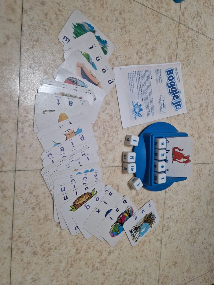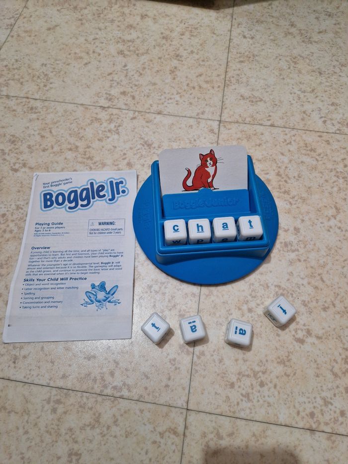 Je vends le jeu éducatif Boggle Jr. - Type de produit : Jeu éducatif - Marque : Autre - Âge recommandé : De 4 à 6 ans - Composition du lot : Plateau de jeu, dés avec lettres, plein des cartes en recto verso Très bon état. Un excellent jeu pour développer les compétences en orthographe et en vocabulaire de votre enfant. N'hésitez pas à me contacter pour plus d'informations !