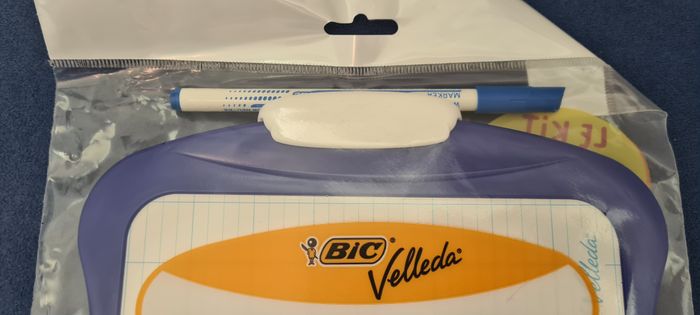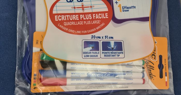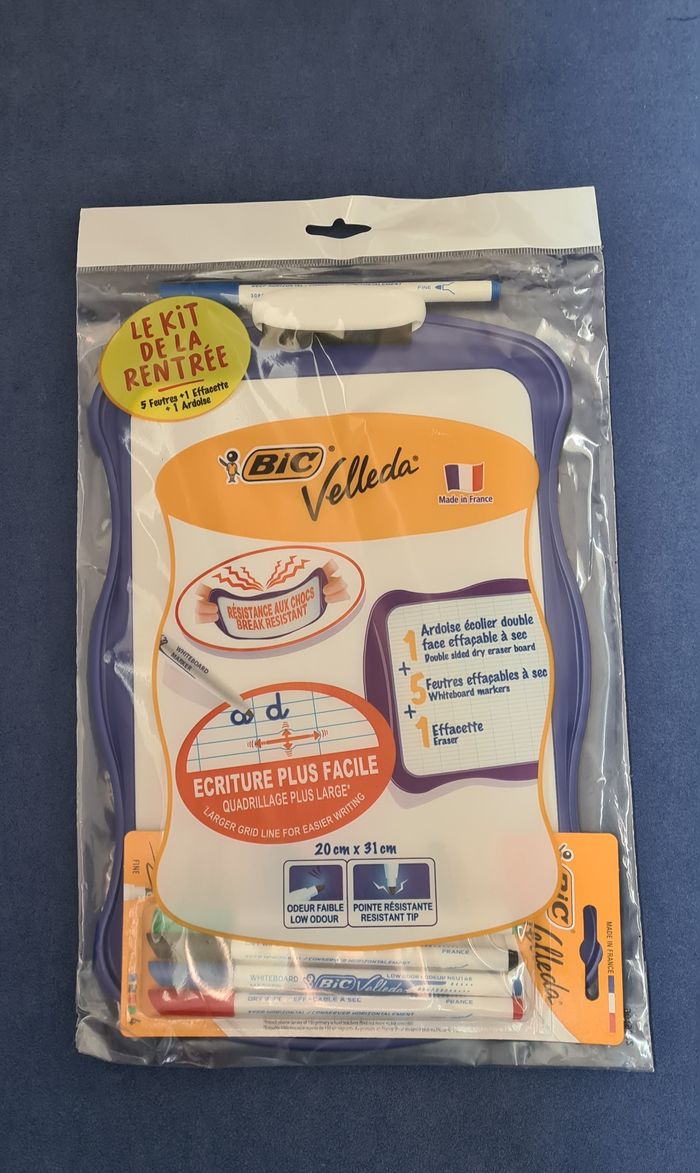 Kit Bic Velleda composé de : - 1 ardoise effaçable à sec double face (1 côté uni, 1 côté quadrillage style cahier d'écolier), bords bleu. Résistante au choc - 5 feutres effaçables : 2 bleus, 1 rouge, 1 vert, 1 noir. Pointe résistante, faible odeur. - 1 effacette qui peut s'accrocher au bord de l'ardoise. Dim : 20 x31 cm Neuf, jamais ouvert, doublon. Prix d'achat 3.59 #ardoiseeffaçable #ardoiseblanche #velleda #bic #fournituresscolaires #mar-tayenfant #mar-taybureau