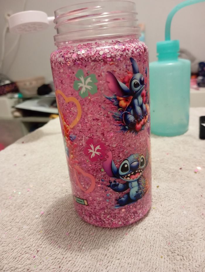 Je créer des gourdes a effet boule de neige Noir , rose pâle , bleu , fuchsia Choix des sticker Choix des paillettes Choix de la couleurs de la gourde Paille intégrée en embout en plastique et refermable sur elle même :) N'hésitez pas a me contacter pour que je vous envoie les photos des sticker dans le thème désirez Beaucoup de thème dispo Kpop demon hunter , stitch , angel , harry potter , pokemon , Minnie , mickey , roi lion , Minecraft, nemo , Winnie l'ourson Etc...