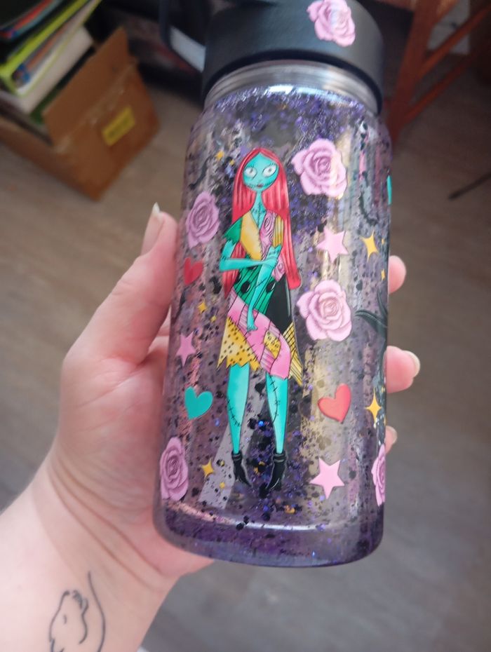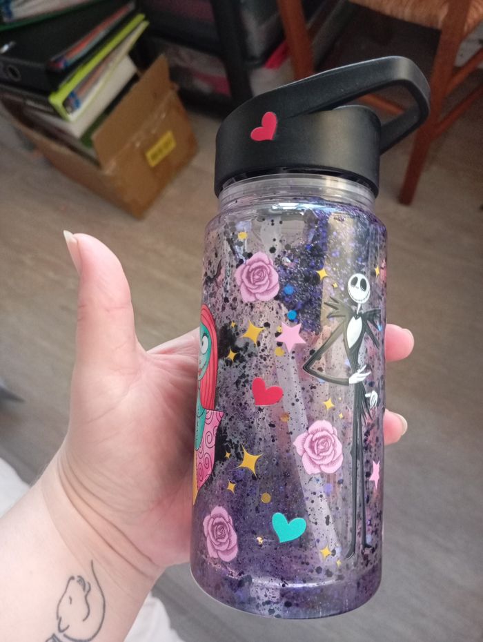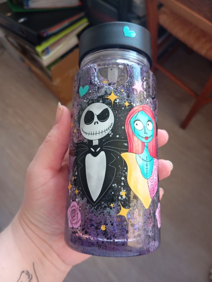 Je créer des gourdes a effet boule de neige Noir , rose pâle , bleu , fuchsia Choix des sticker Choix des paillettes Choix de la couleurs de la gourde Paille intégrée en embout en plastique et refermable sur elle même :) N'hésitez pas a me contacter pour que je vous envoie les photos des sticker dans le thème désirez Beaucoup de thème dispo Kpop demon hunter , stitch , angel , harry potter , pokemon , Minnie , mickey , roi lion , Minecraft, nemo , Winnie l'ourson Etc...