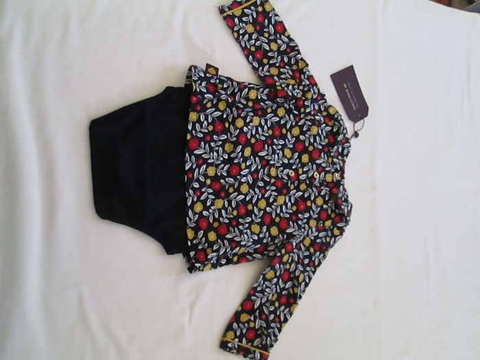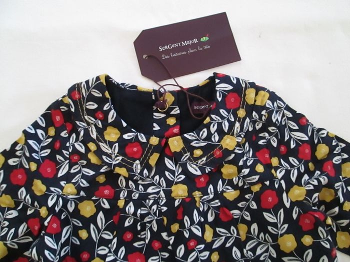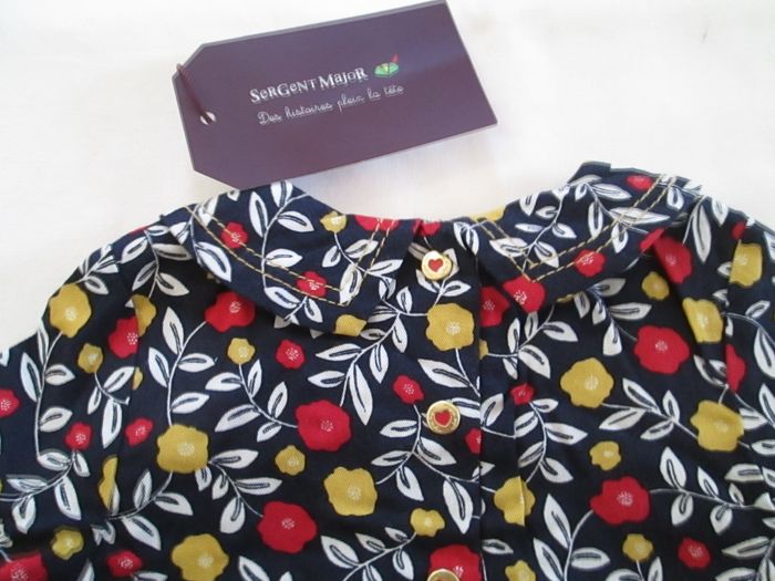 Vends tunique 2 en 1 Sergent Major bleue marine fleurie avec body intégré. Tunique 100 % viscose et body 100 % coton. La tunique s'attache avec des pressions fantaisies dans le dos. Taille 6 mois. Prix d'achat 19,99 €. Neuve, jamais portée, vendue avec étiquette.