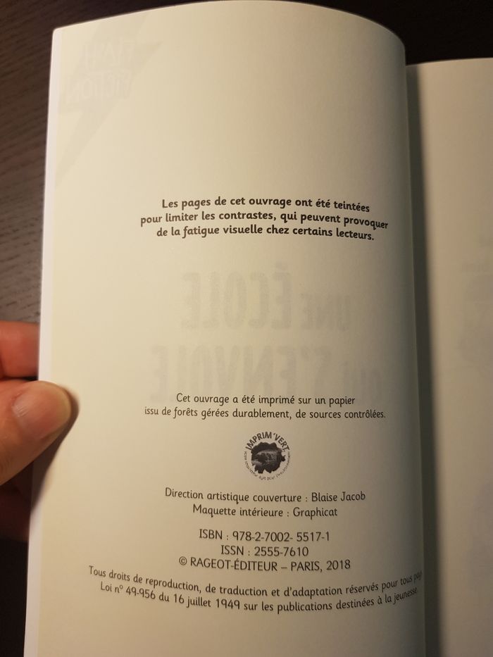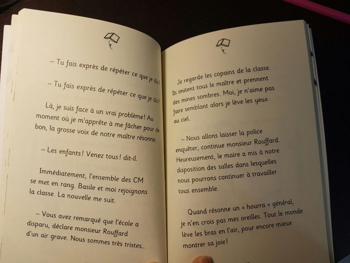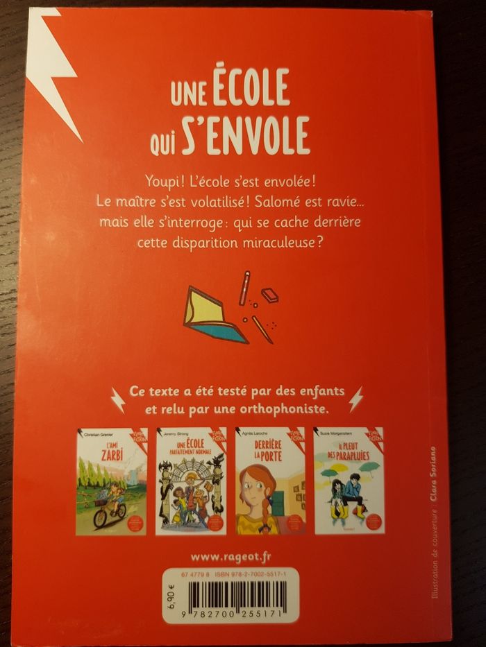Livre à lectures courtes, accessibles à tous, adaptés aux Dys. Les pages sont teintées pour limiter les contraste, qui peuvent provoquer de la fatigue visuelle chez certains lecteurs. L'histoire : L'école de Salomé s'est envolée et le maître s'est volatilisé ... Tout ça n'est pas pour déplaire à la petite fille. Car ce que Salomé préfère à l'école, c'est clairement l'heure de la récréation ... Mais son copain Basile, lui, s'inquiète. Alors, tous deux, ils enquêtent ... Et ils s'interrogent : et si la disparition de l'école était liée à cette nouvelle élève qui s'amuse à imiter Salomé? [site de l'éditeur]