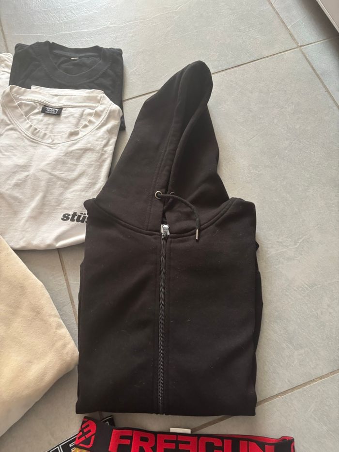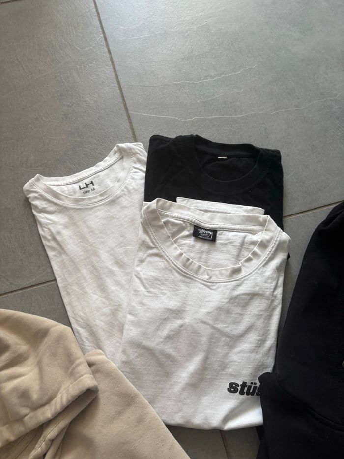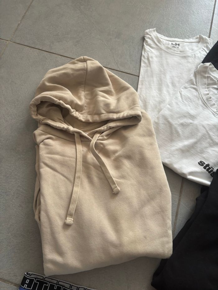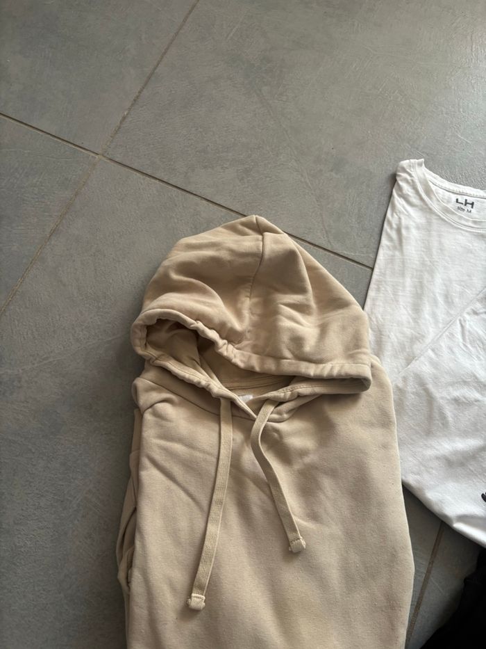 Taille M. Lot qui se compose d un sweat a capuche beige, d un gilet noir bien chauds, de 3 tee shirts et 3 caleçons . Maison non fumeur entretien du linge .
