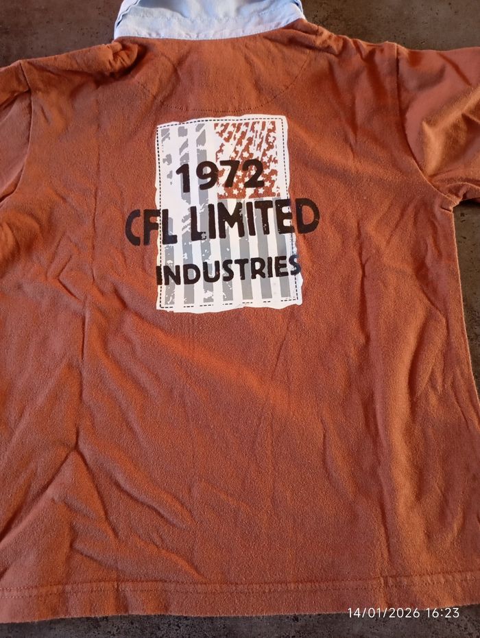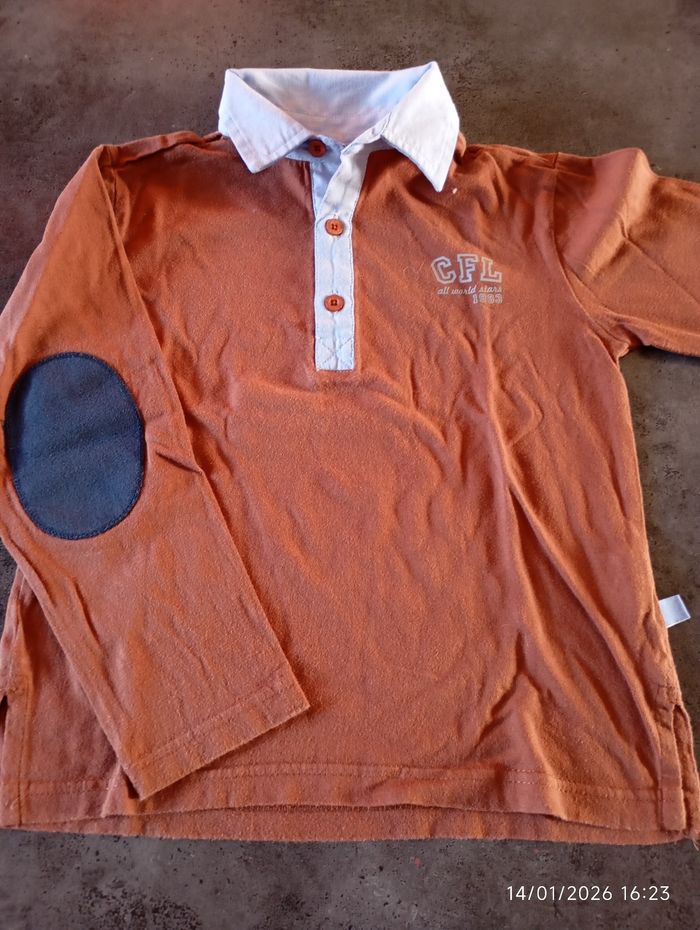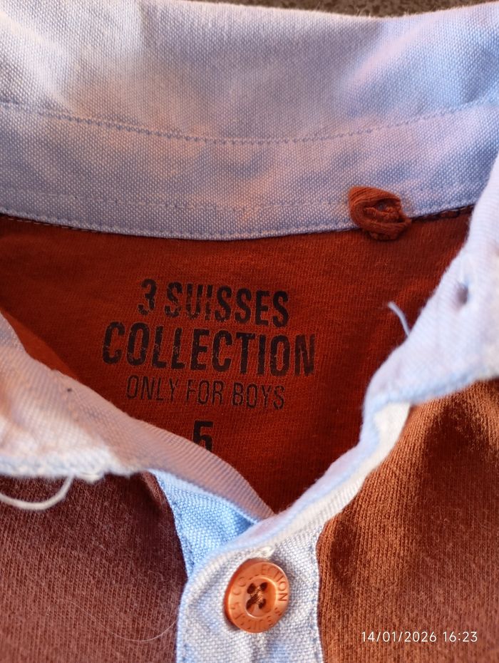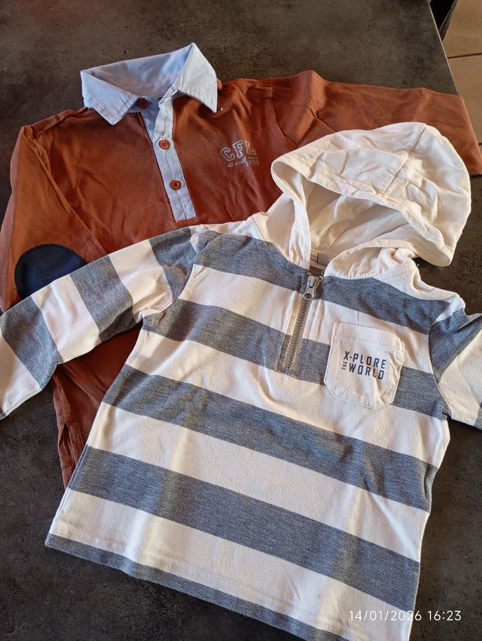 1 sweat à capuche rayé et 1 polo marron avec l'encolure bleue de marque 3 Suisses. Sont en très bon état.