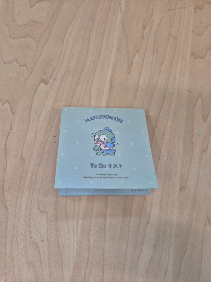 Mini bloc memo Sanrio Hangyodon "To do List". Papier, environ 9 x 8 cm. En parfait état (jamais utilisé). 🌸Les prix sont fixes, car ils intègrent les taxes auxquels les pros sont asujettis. Aucune offre ne sera acceptée qu'il s'agisse d'un lot ou d'un article à l'unité, merci. 🌸N'hésitez pas à vérifier la disponibilité de l'article avant de procéder à l'achat.