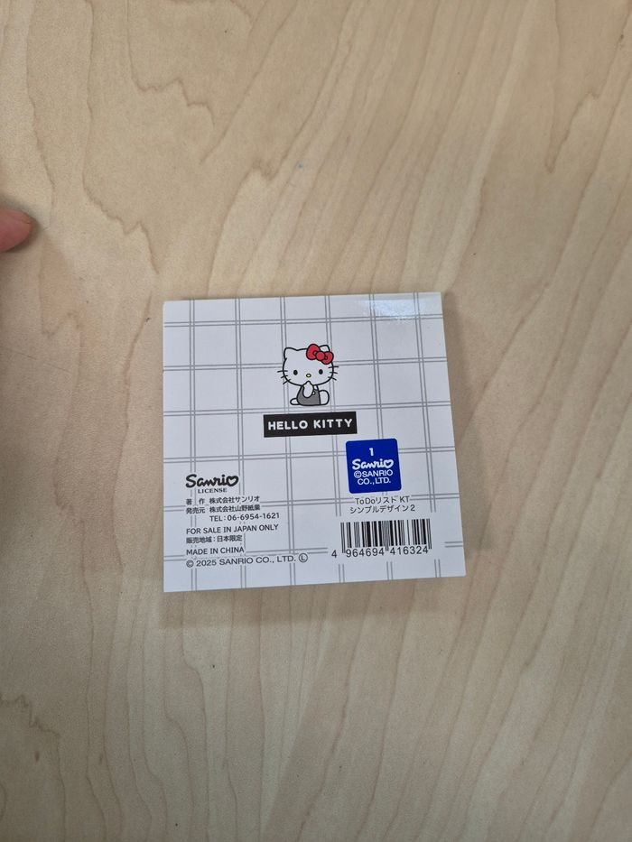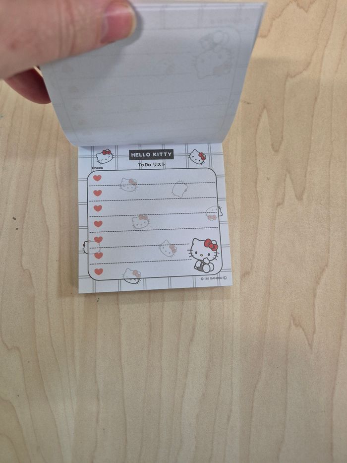 Mini bloc memo Sanrio Hello Kitty "To do List". Papier, environ 9 x 8 cm. En parfait état (jamais utilisé). 🌸Les prix sont fixes, car ils intègrent les taxes auxquels les pros sont asujettis. Aucune offre ne sera acceptée qu'il s'agisse d'un lot ou d'un article à l'unité, merci. 🌸N'hésitez pas à vérifier la disponibilité de l'article avant de procéder à l'achat.