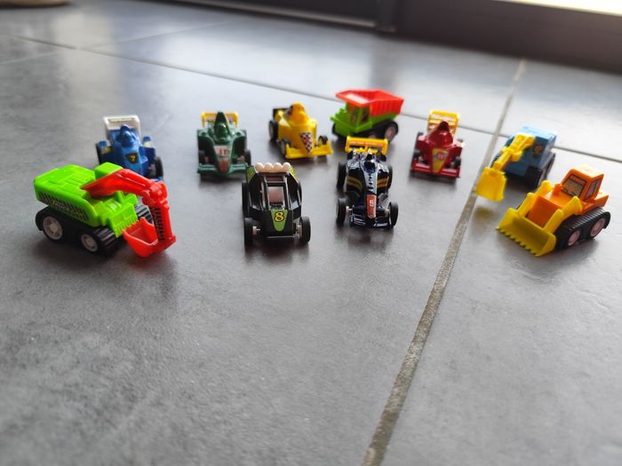 Lot de 10 petites voitures et camions de chantier à friction en très bon état