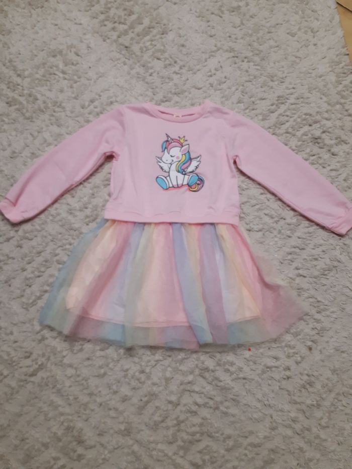 Bonjour 🖐 Robe fille 7/8 ans, haut rose manches longues avec motif licorne, jupe tutu multicolore en tulle. Confortable et légère, idéale pour fêtes et quotidien. Robe neuve jamais portée