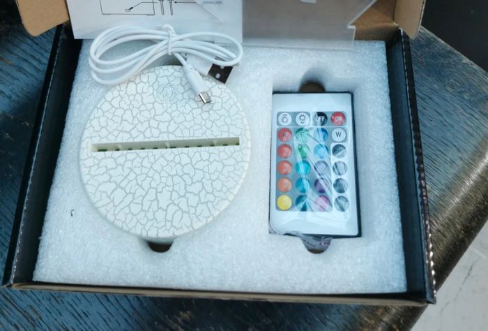 Avec télécommande pour modifier la couleur. Neuve avec sa boîte, le plexiglass est sous film protecteur. Socle blanc change de couleur avec la lampe Vendeur pro, destockage, produit neuf !