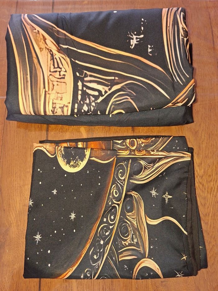 Je vends cette magnifique parure de lit au style céleste et onirique. Le motif central représente une alliance artistique entre le Soleil et la Lune, entourée d’étoiles. Les contrastes entre le noir profond et les nuances cuivrées apportent une atmosphère à la fois chaleureuse et mystique à la chambre. ​État : ​Neuf (jamais utilisée). ​Caractéristiques techniques : ​Dimensions de la housse de couette : 160 x 220 cm. ​Taie d'oreiller : 1 taie rectangulaire assortie incluse. ​Matière : Tissu doux, résistant et facile d'entretien.