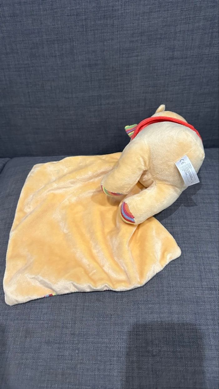 Une peluche qui fait doudou mouchoir jaune Winnie l’ourson. Il fait aussi petit hochet mais bruit léger pour laisser dormir bébé. Et les oreilles sont légèrement sensorielle également Elle est toute douce et en super état Peluche nicotoy