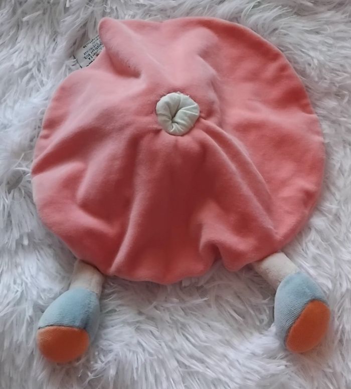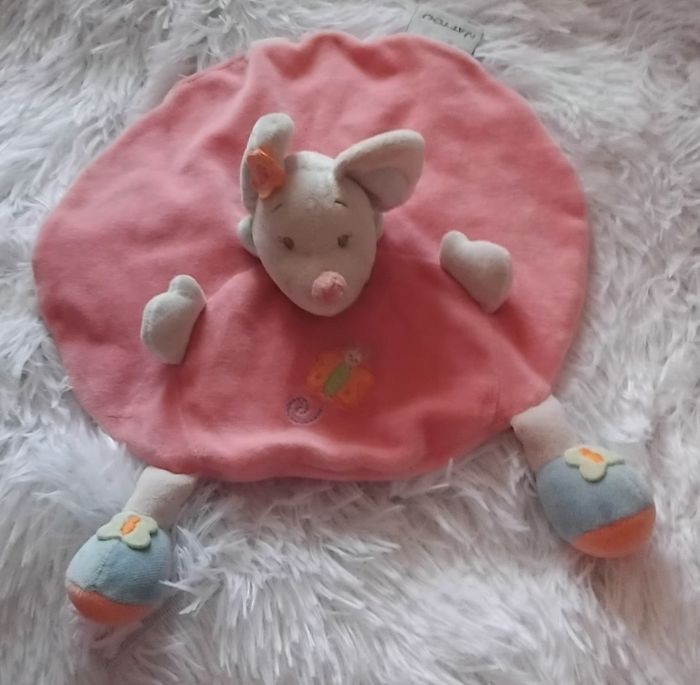Doudou plat rond en velours de couleur rose Souris sur le milieu du doudou 2 petits bras blanc sortent sur le haut du cercle Papillon brodée sur le bas du doudou Soulier en velours de couleur bleu avec papillon sur le dessus Petite fleur sur l une des oreilles