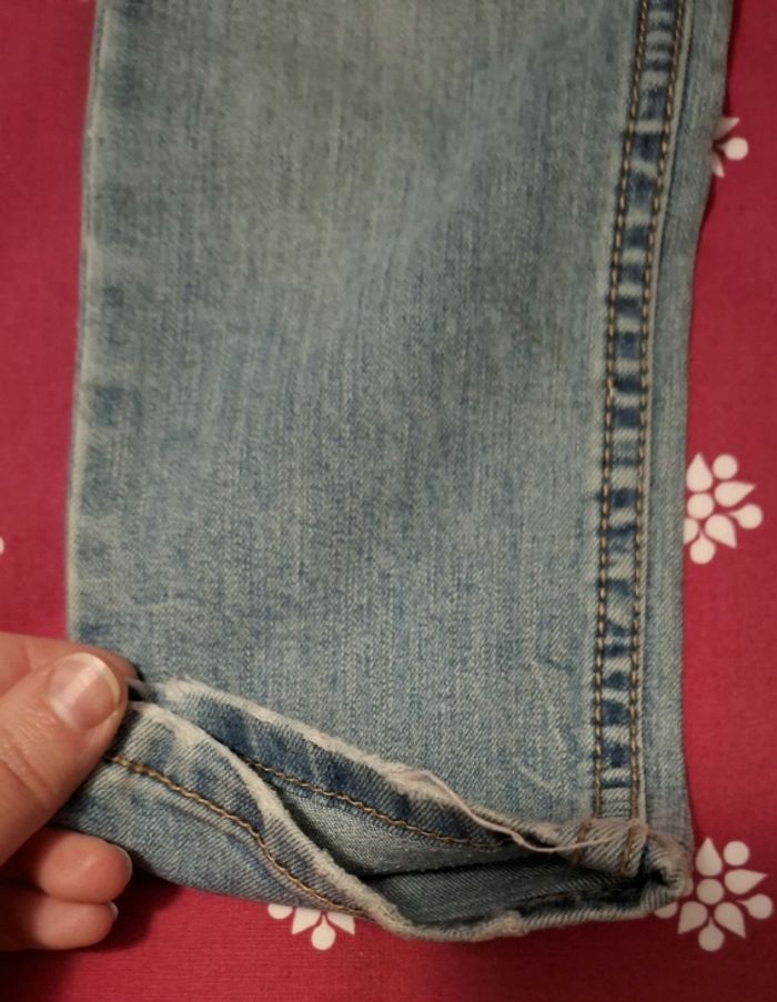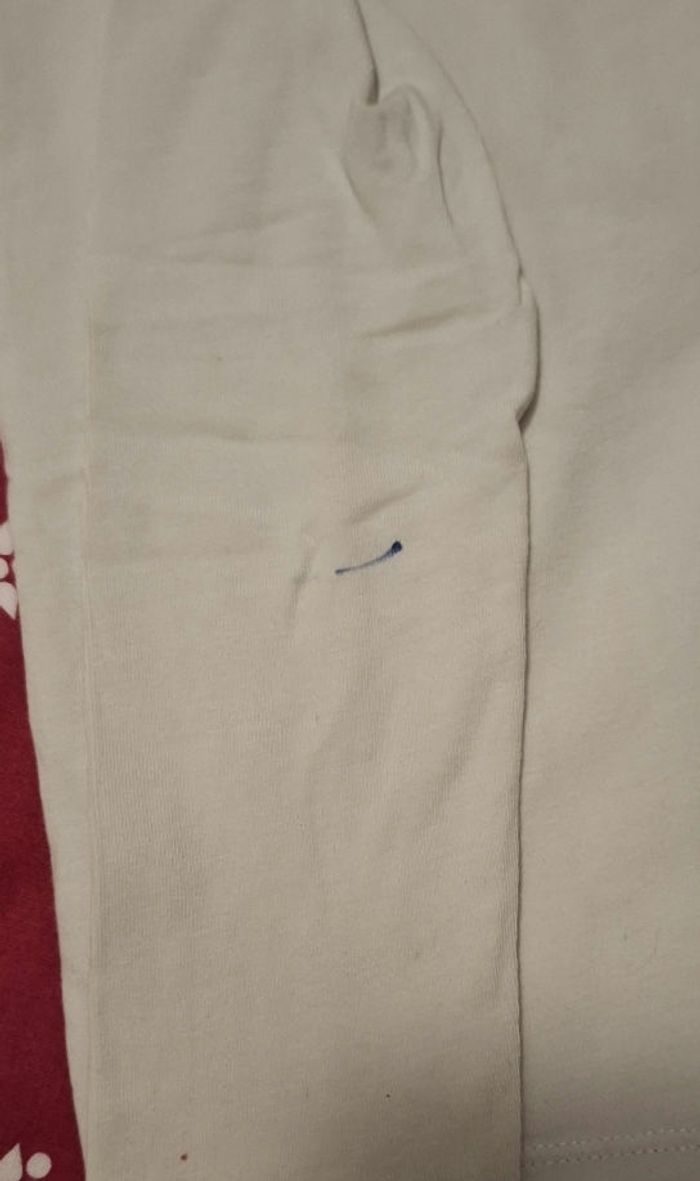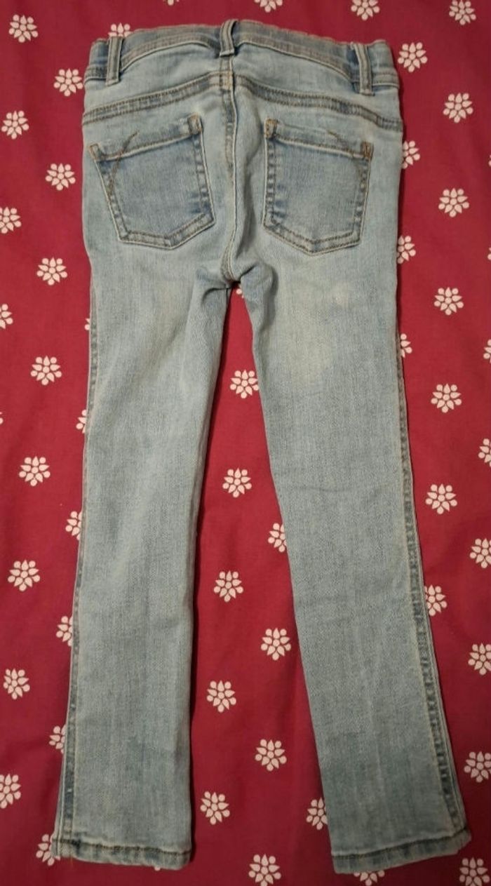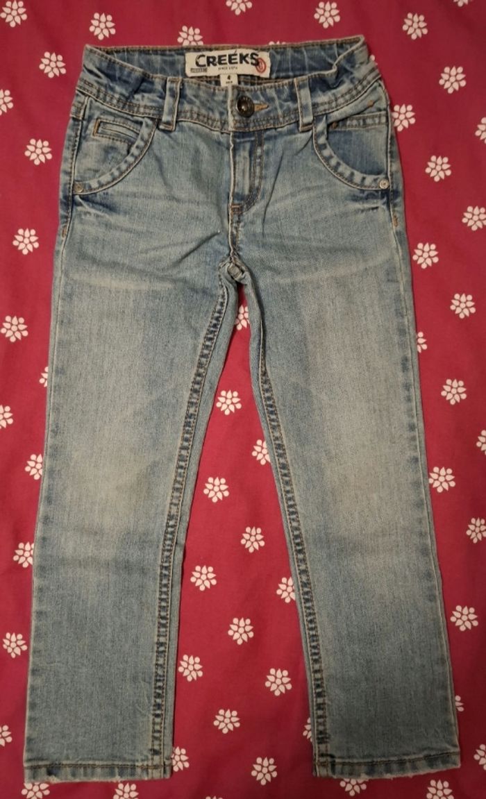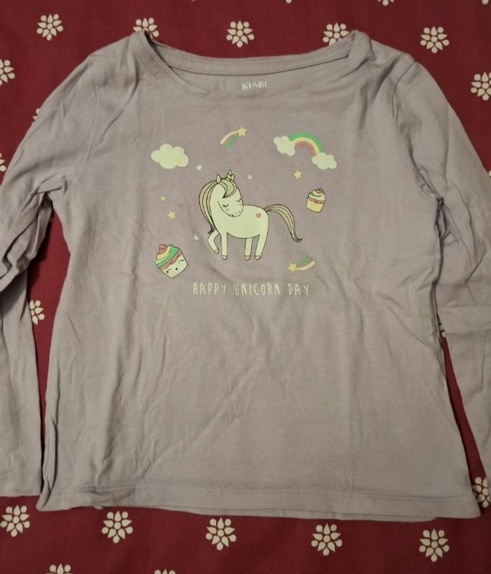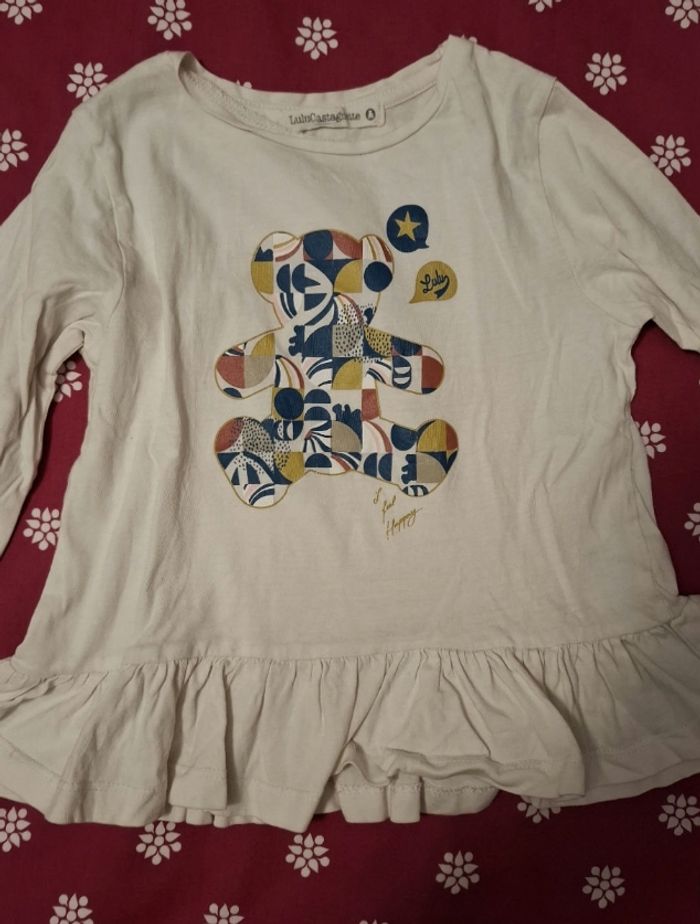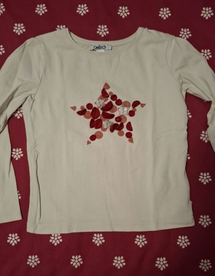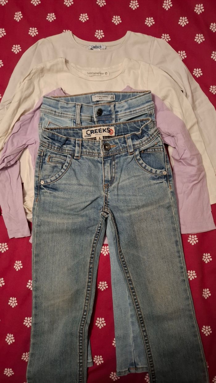3 Tee-shirt manches longues. 1 violet clair, 1 blanc avec un ours, 1 blanc avec une étoile rouge et tache de stylo sur la manche voir photo. 2 jeans, le jeans creeks est use au fond de la jambe voir photo.