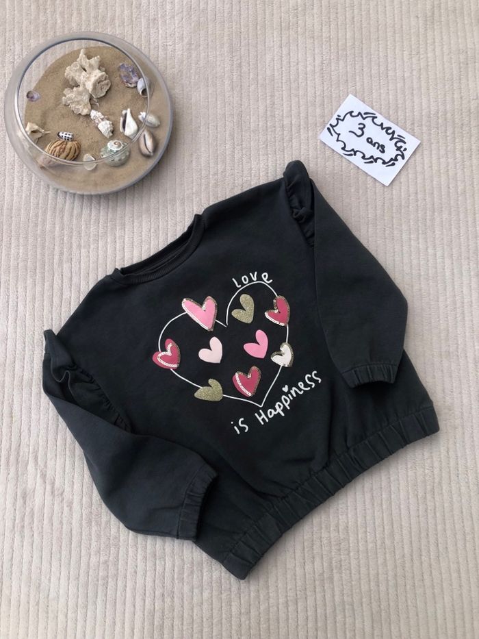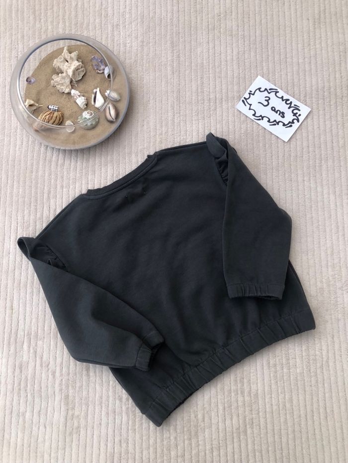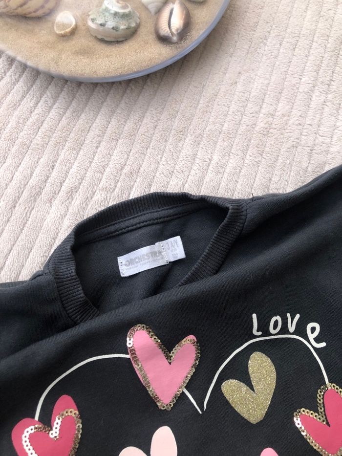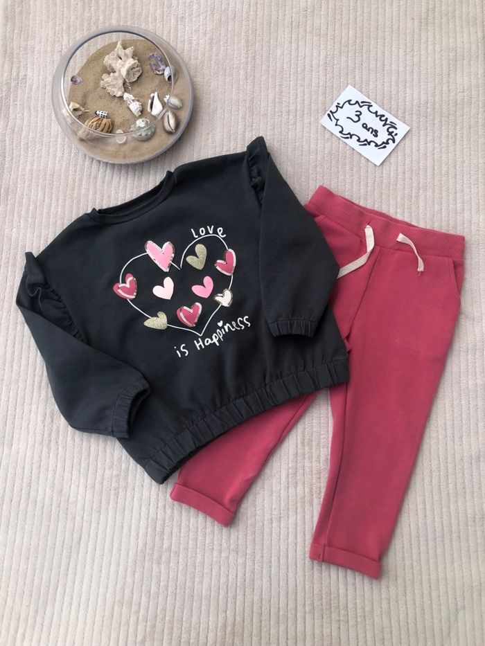 Ensemble de jogging 2 pièces en scruba : - Sweat, coloris unis, encolure ronde en bord-côte, motifs fantaisie sur le devant (print placé, sequins et détails pailletés), dos uni, épaules tombantes, empiècement volanté aux emmanchures, manches longues bouffantes, poignets et base élastiqués. - Pantalon de jogging, coloris uni, taille élastiquée en bord-côte, cordon de serrage contrasté avec lurex doré incrusté, deux poches italienne sur le devant. Ensemble, 3 ans (98 cm), très bon état (une petite marque légère sur une des jambes - cf photo), vêtement de premières mains, Orchestra. 🛍 Dressing trié par taille, les catégories sont accessibles à partir de mon profil ! Bon shopping ! #fille3ansnikita40000