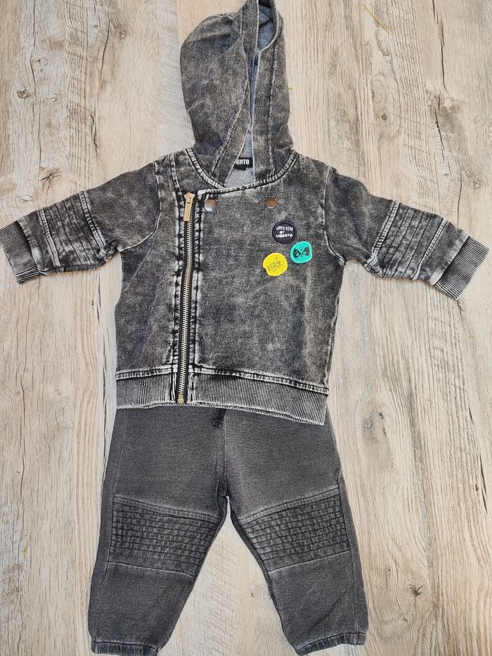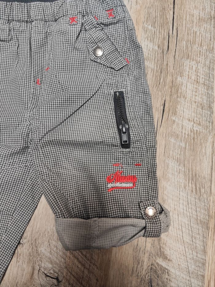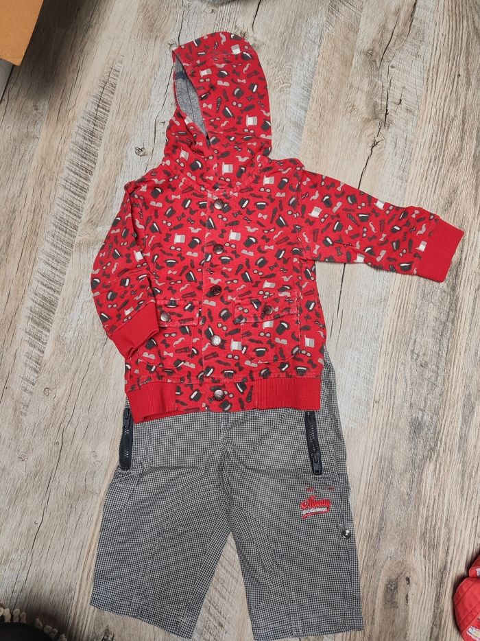 Lot comprenant - un ensemble 2 pièces pantalon gris et veste rouge marque Premaman. La pantalon peut être maintenu retroussé grâce à un bouton pression - un ensemble survetement gris et noir couleur style vieilli , marque Liberto - une combinaison sans pieds, capuche de petit lutin, gris clair de marque TQF collection - un ensemble 3 pièces Sergent Major ( 6 mois-68cm) avec t-shirt manches longues, salopette épaisse orange et salopette en jean gris clair - une paire de chaussons Mickey taille 3/6 mois a priori ( pas de mention sur l'étiquette) - 3 bavoirs bandanas intérieur éponge ( 2 à scratch, 1 à bouton pression). Bon état/très bon état