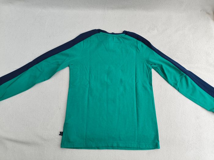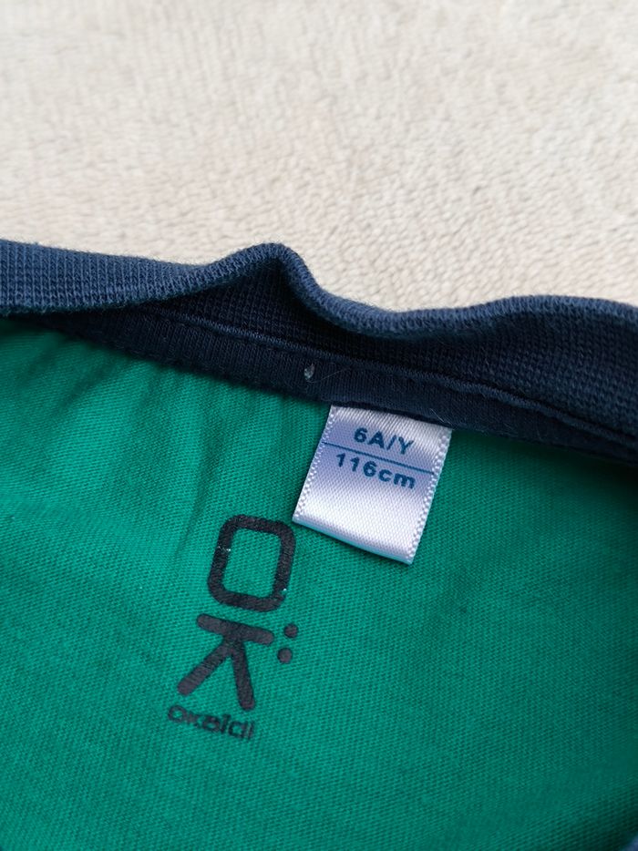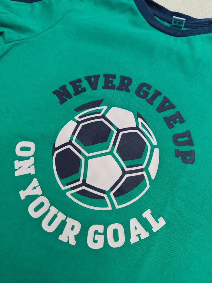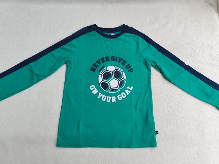 T-shirt à manches longues Marque Okaïdi Taille 6 ans, 116 cm • Coloris vert, marine • Inscription "Never give up on your goal", imprimé ballon de foot • Tissu fin • Quelques bouloches En très bon état #evelyne_garcons_6ans #evelyne_garcons