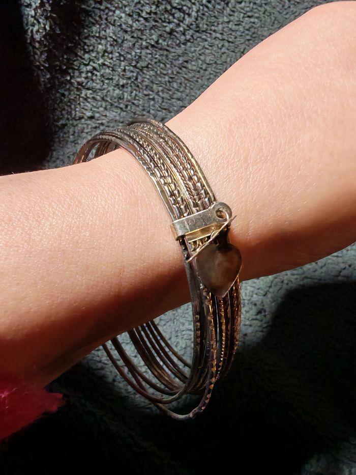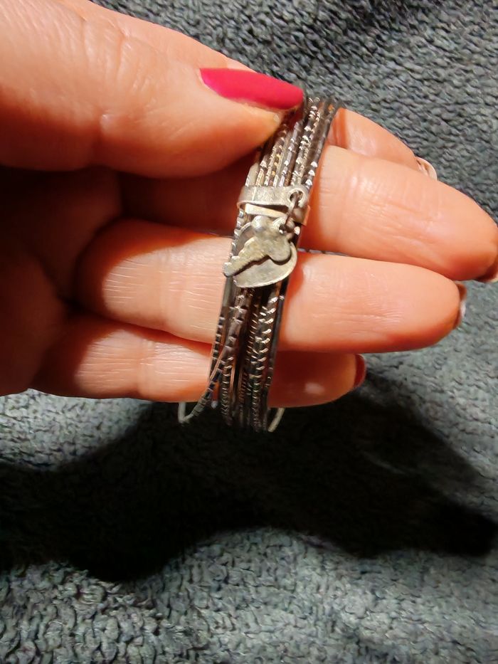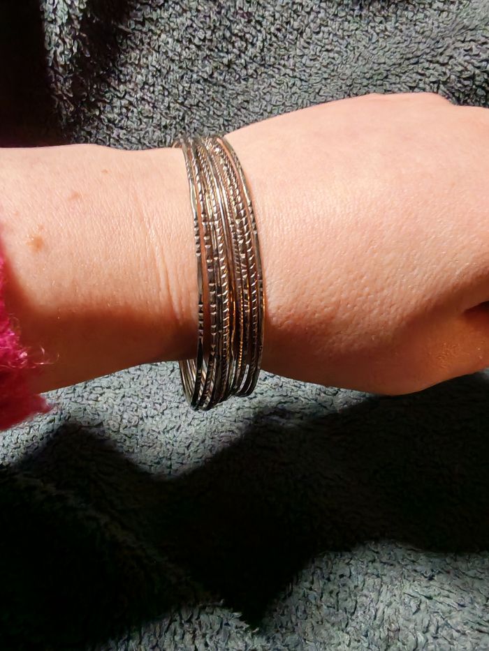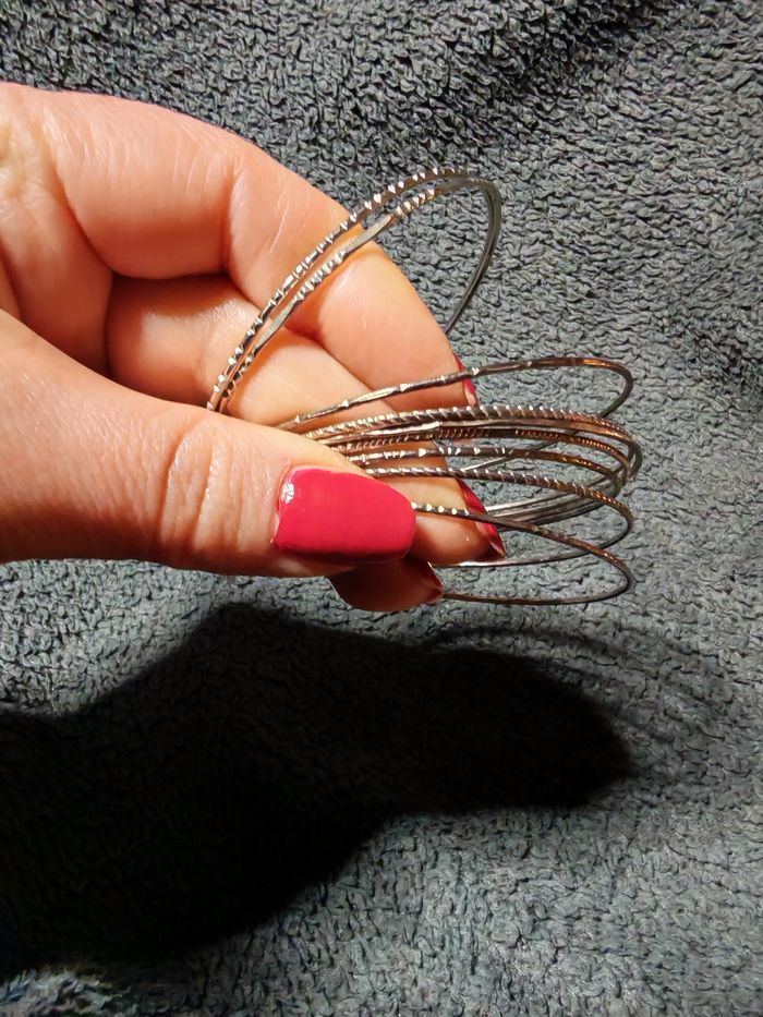 Bracelets 9 jonc en acier inoxydable. Bracelets fantaisie, couleur argentée, en très bon état, attachés pa un petit breloque clé/coeur. Bracelet type semainier, mais en nombre de 9, on peut les séparer si on veut en enlevant l'attache. Dimensions : Diamètre : 6,5 cm Epaisseur d'un bracelet : 1,5 mm Epaisseur de l'ensemble : 1 cm Poids : 18g