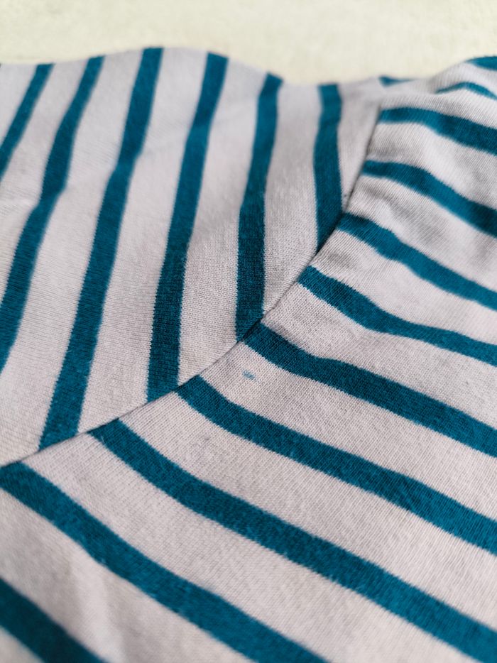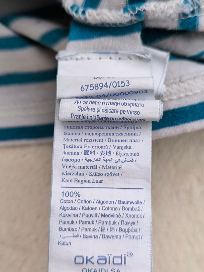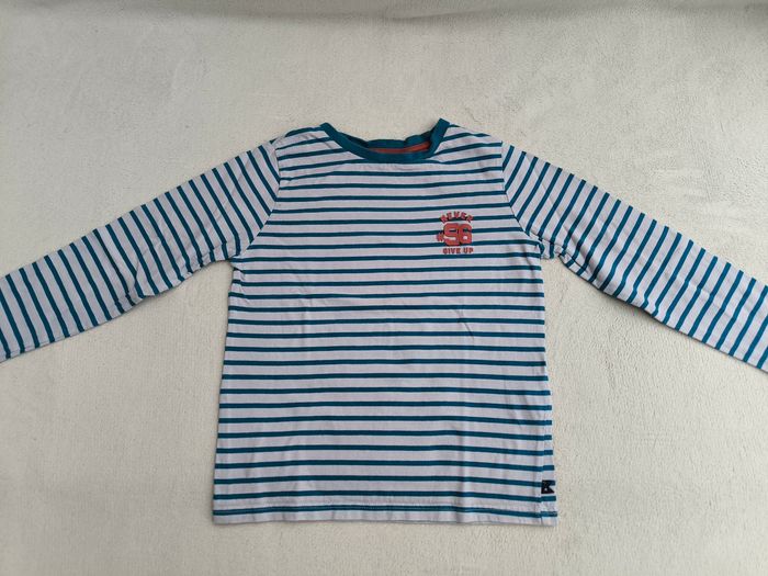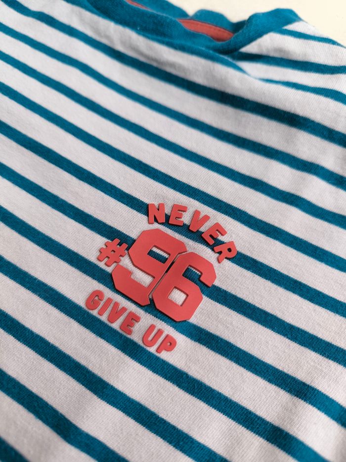 T-shirt à manches longues Marque Okaïdi Taille 6 ans, 116 cm • Coloris crème, bleu, orange • Inscription en texture"Never give up on 96", rayures horizontales • Coton fin • Petite marque à l'avant En très bon état #evelyne_garcons_6ans #evelyne_garcons