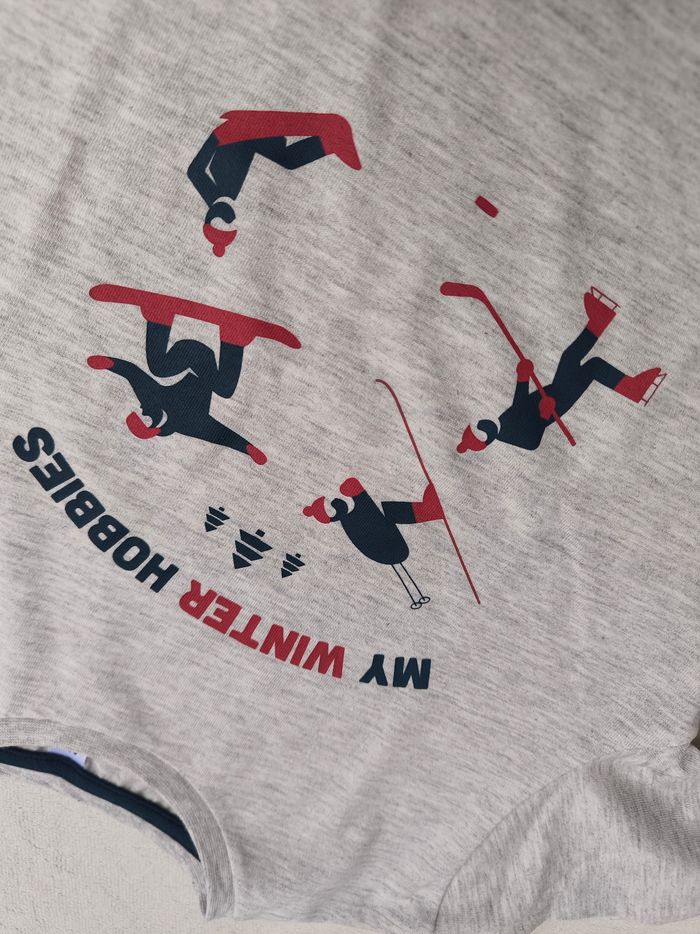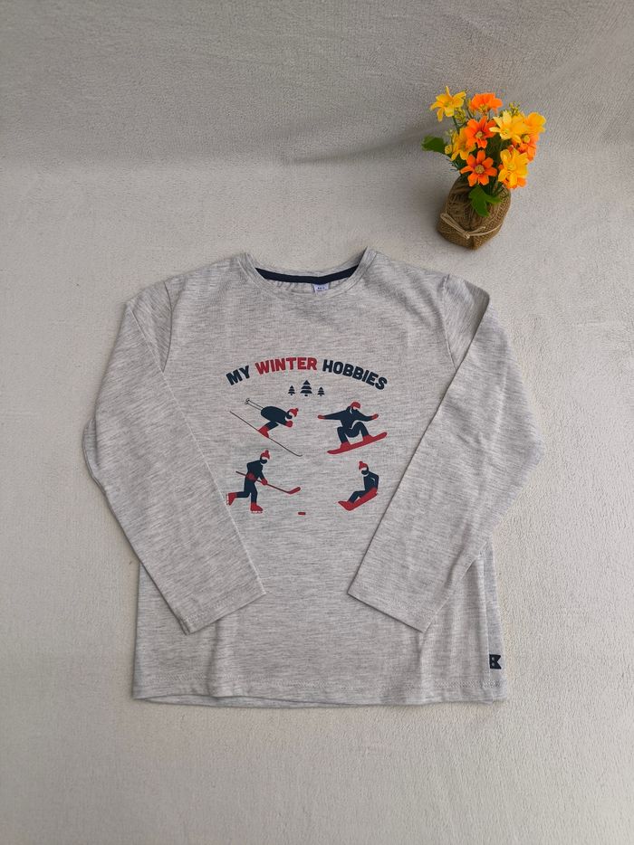 T-shirt à manches longues Marque Okaïdi Taille 6 ans, 116 cm • Coloris gris, marine, rouge • Inscription "My winter hobbies", imprimés sapins, ski, snowboard, luge... • Coton fin En très bon état #evelyne_garcons_6ans #evelyne_garcons
