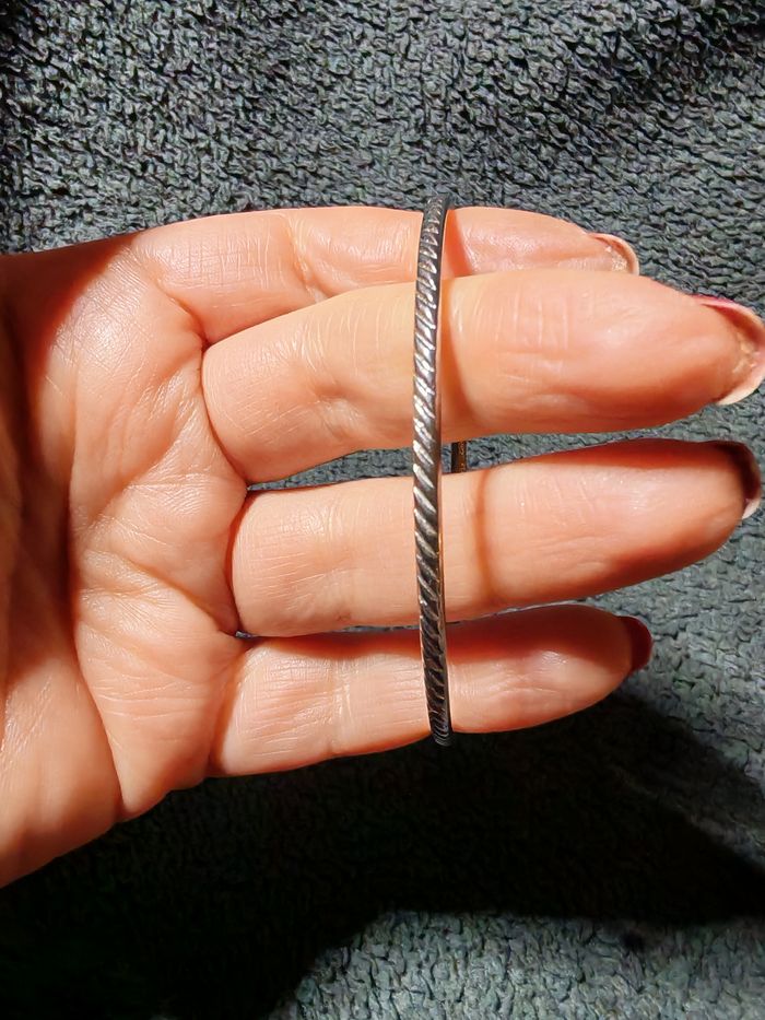Bracelet jonc en métal argenté, le bracelet à reliefs, n'est pas lisse. Jonc en très bon état. Dimensions : Diamètre : 7 cm Epaisseur : 2,5 mm Poids : 7g