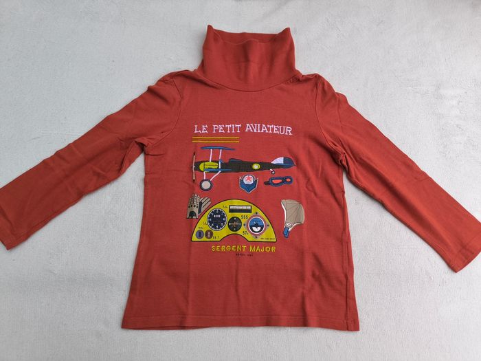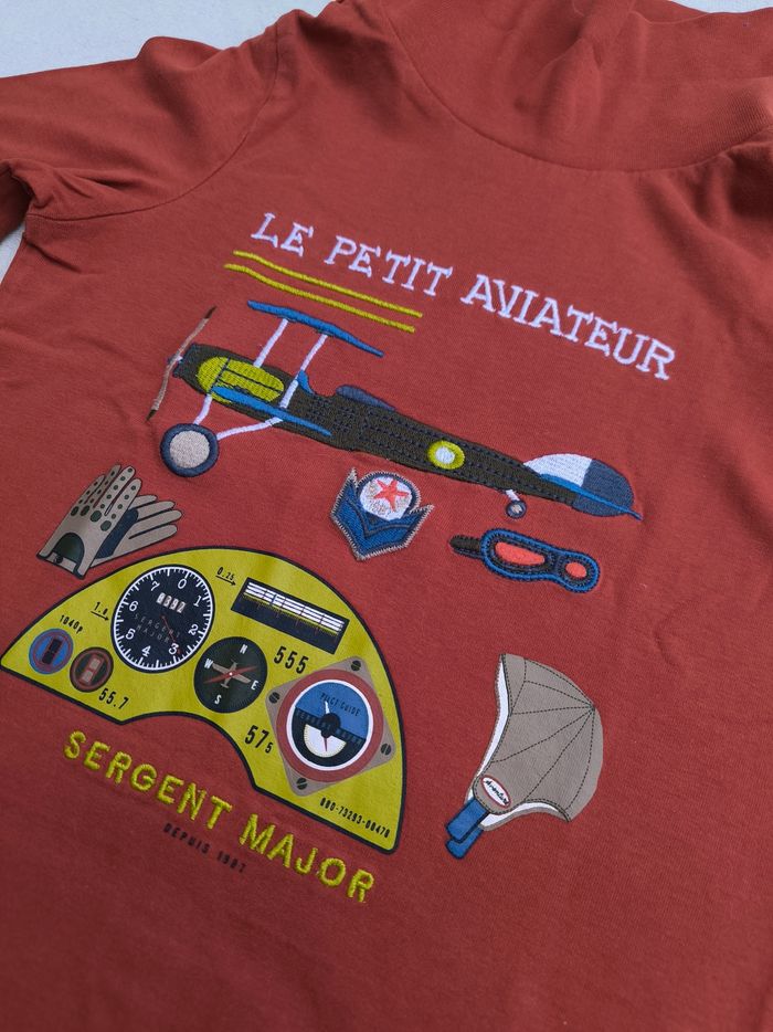Sous-pull à manches longues Marque Sergent Major Taille 7 ans, 122 cm • Coloris orange, blanc, bleu, jaune • Col montant • Inscription brodée "Le petit aviateur", broderie avion, lunettes, imprimés compteur • Coton fin En très bon état #evelyne_garcons_7ans #evelyne_garcons
