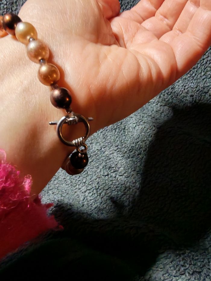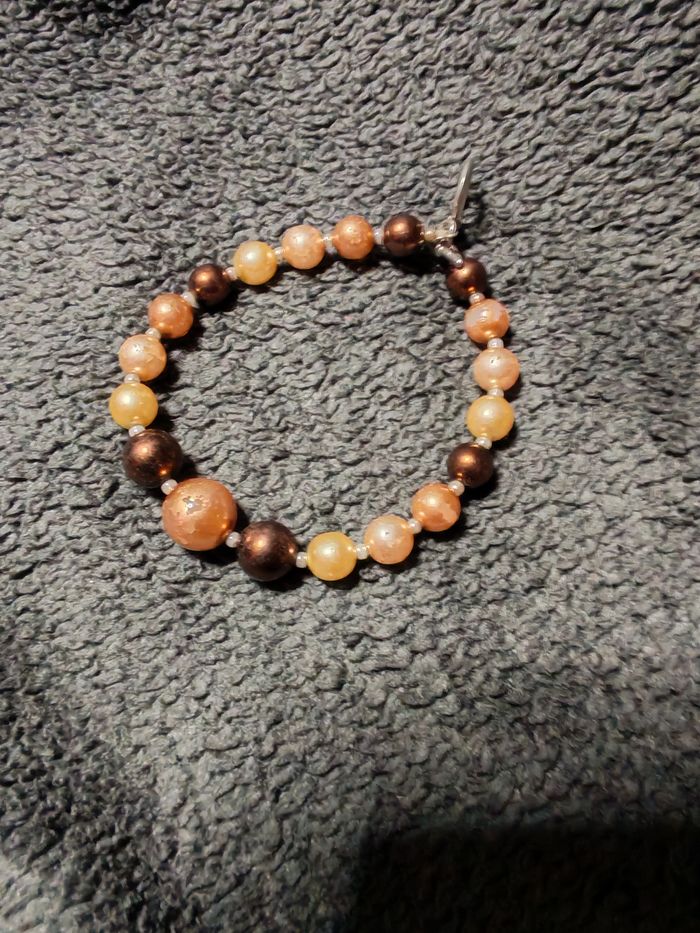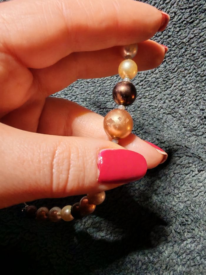 Bracelet de perles plastique marron, beige et doré avec joli fermoir argenté. Bracelet est en état satisfaisant car les perles sont écaillées par endroit. Dimensions : Longueur : 19 cm Diamètre perle : 5 mm et 8 mm Poids : 17g