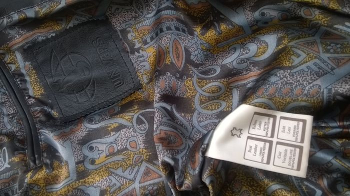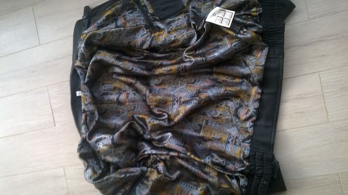 taille 54 mesures épaule 56 cm longueur 74 cm sous aisselles 62 cm très belle doublure 2 poches +une dedans fermeture éclair + pressions les poignées sont avec des pressions