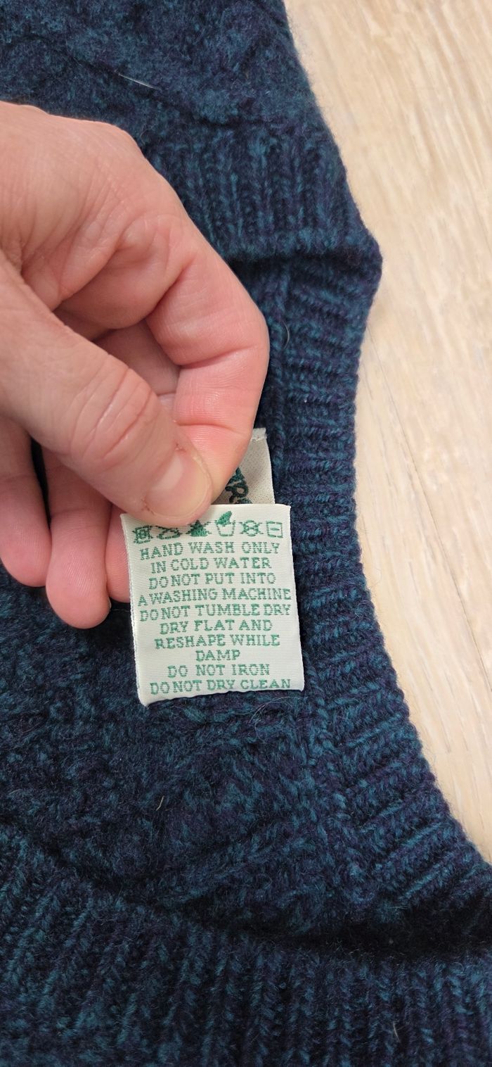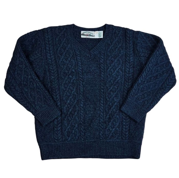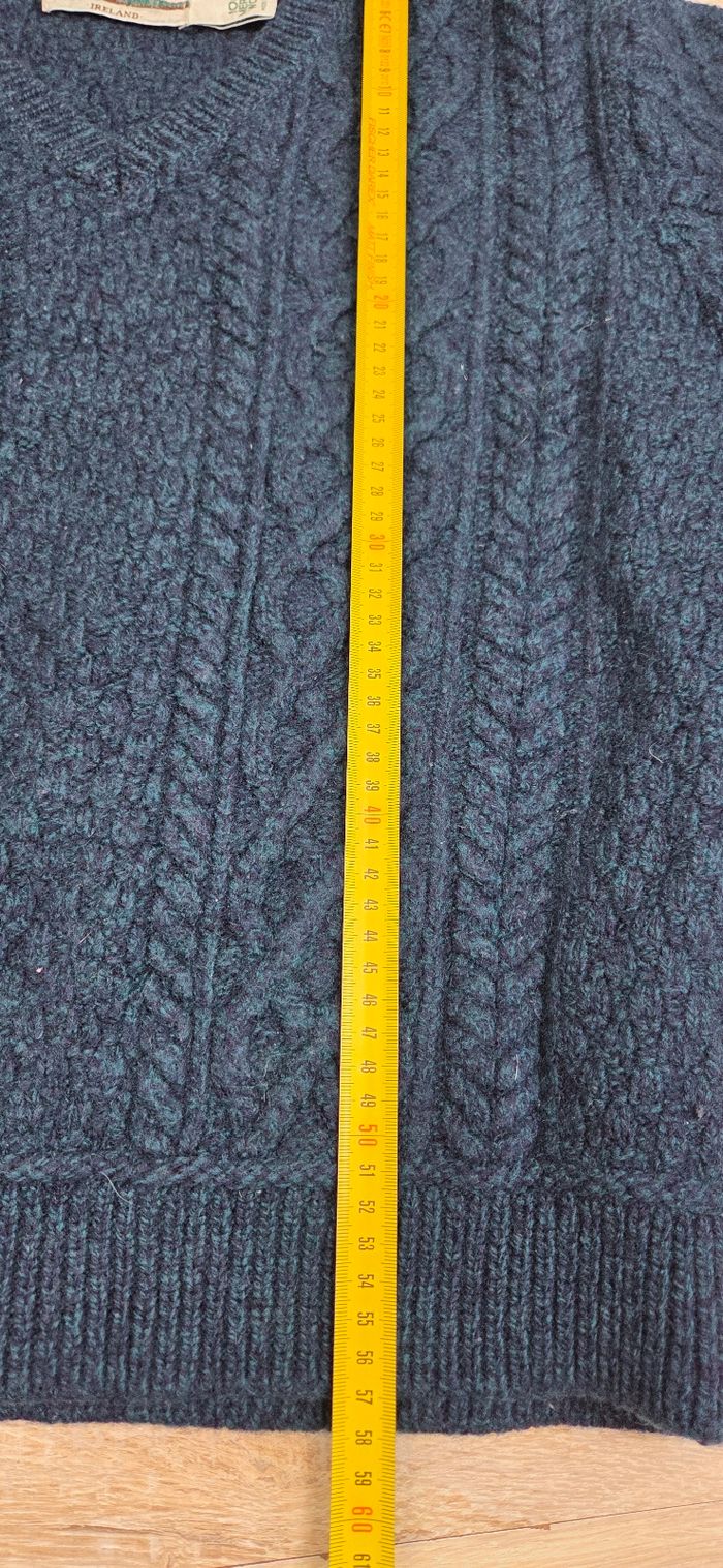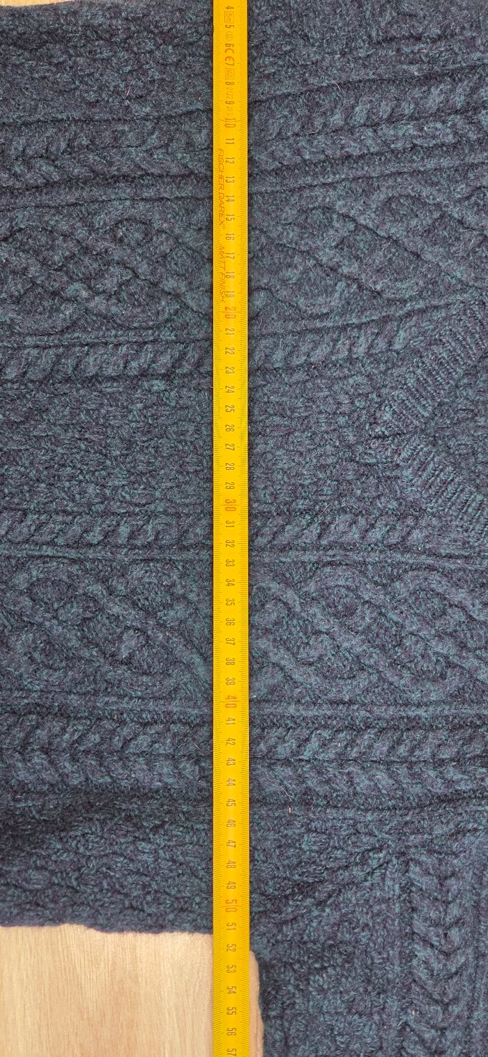 Authentique pull Aran Crafts – Ireland, en 100 % laine mérinos, tricot traditionnel irlandais à motifs torsadés Couleur bleu marine profonde, intemporelle et élégante Maille épaisse et chaude, idéale pour l’automne/hiver Col en V, manches longues, finitions côtelées Composition : 100 % laine mérinos. Entretien : lavage à la main à froid (selon étiquette) État : très bon état général Genre : Femme Taille indiquée : L (voir mesures) Mesures à plat : Longueur : 58 cm Aisselles : 51 cm Longueur de manche : 46 cm