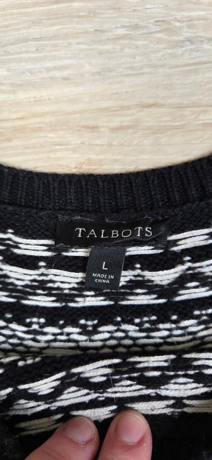 Pull Talbots pour femme, coloris noir avec jolis motifs jacquard blancs d’inspiration nordique sur le haut Matière agréable et confortable, idéal pour l’automne/hiver ou les soirées fraîches Coupe droite, facile à porter au quotidien Composition : 80 % coton 20 % rayonne 1 % nylon État : très bon état, pas de défaut à signaler (voir photos). 🔹 Taille indiquée : L 🔹 Mesures à plat : Longueur : 65 cm Aisselles : 49 cm Longueur de manche : 55 cm Envoi sous 24h