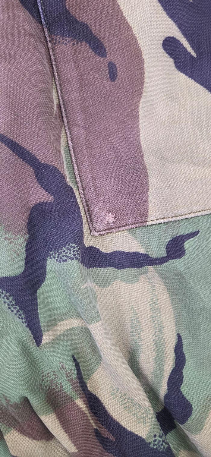 Pantalon treillis camouflage style militaire vintage Modèle robuste avec fermeture zippée, boutons, passants pour ceinture et grandes poches cargo sur les côtés Coupe droite, tissu résistant, idéal pour un look workwear, streetwear ou collection militaire Présence de légères traces d’usure visibles sur les photos (petits accrocs/manque 1 bouton), ce qui reste cohérent avec le style vintage et n’altère pas le port Mesures à plat : • Longueur totale : 105 cm • Entre jambes : 76 cm • Longueur manche / largeur taille à plat : 37 cm Merci de bien vérifier les mesures avant achat État : très bon état vintage Couleur : camouflage vert/marron Envoi sous 24h