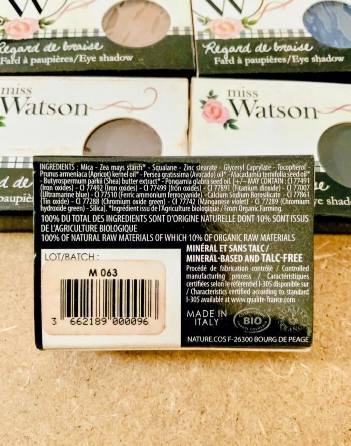 Fards à paupières Miss W / Miss Watson – Neufs Neufs, jamais utilisés. Idéal pour les fans de maquillage naturel, bio et minéral. Vendu à l'unité ! Caractéristiques : • Fards à paupières individuels avec applicateur mousse • Formule minérale et sans talc • 100 % ingrédients d’origine naturelle, dont 10 % issus de l’agriculture biologique • Texture douce et facile à travailler • Plusieurs teintes : neutres, foncées, rosées, bleutées, etc. • Fabriqué en Italie Ingrédients principaux (extraits) : Mica, amidon de maïs, squalane, zinc stearate, huiles végétales (abricot, avocat, macadamia, karité), pigments minéraux (CI 77491, CI 77492, CI 77510, etc.). État : Neuf Marque : Miss W / Miss Watson Vendus en lot 25€ ou à l’unité 3€ (Prix boutique 10,50€) Avant achat merci de m'indiquer quelle est le n° de couleur que vous souhaitez (sur les boîtes)