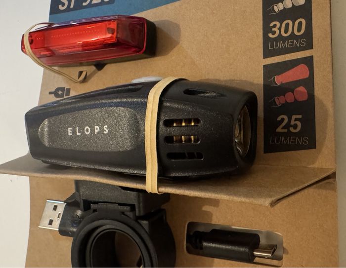 Kit d'éclairages puissants avant et arrière, rechargeable USB, à LED, pour les déplacements urbains comme pour le vélo de route. Neuf dans sa boîte d'origine