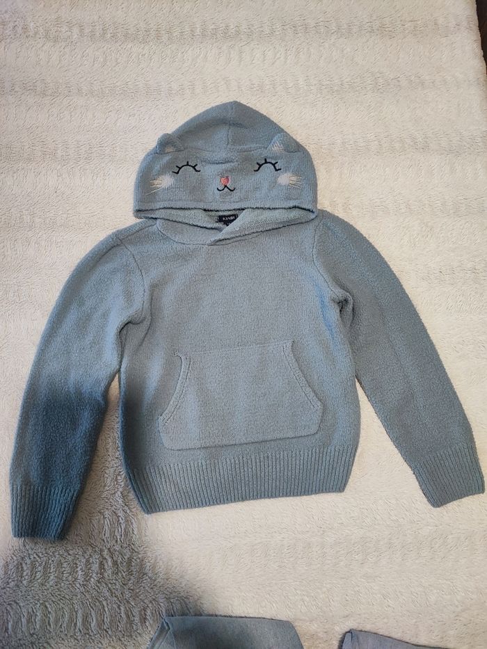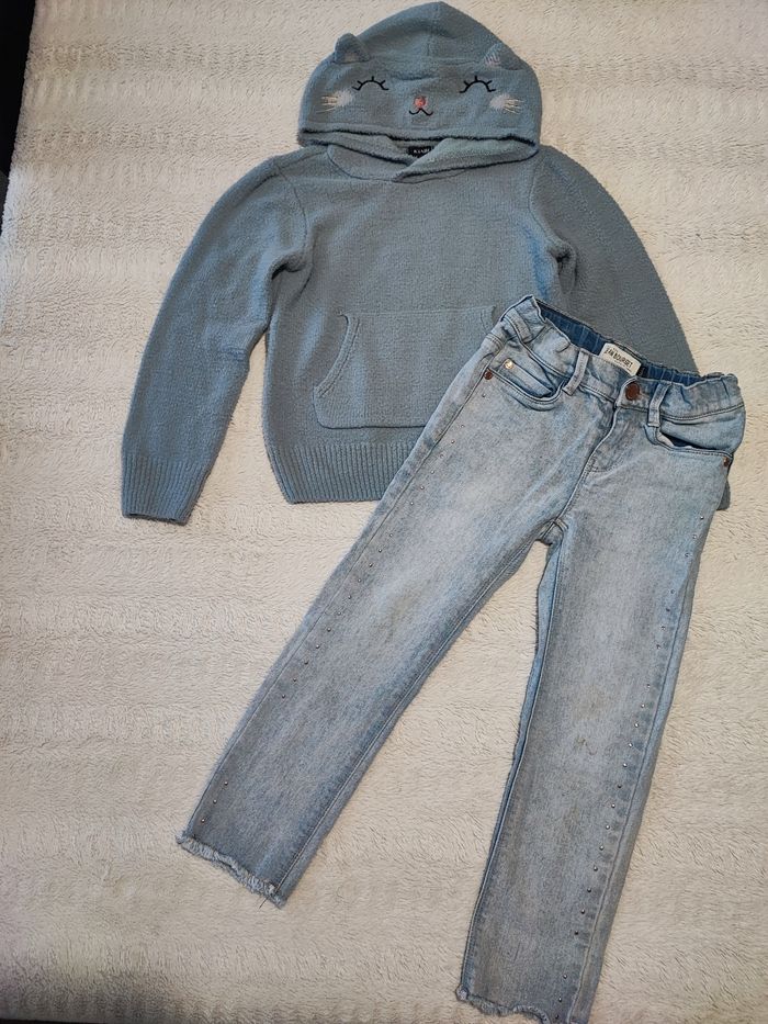 Sweat pull à capuche motif chat Kiabi en très bon état Et jean slim jean bourget juste petite tâche peu visible sur les genoux #lucci6ans