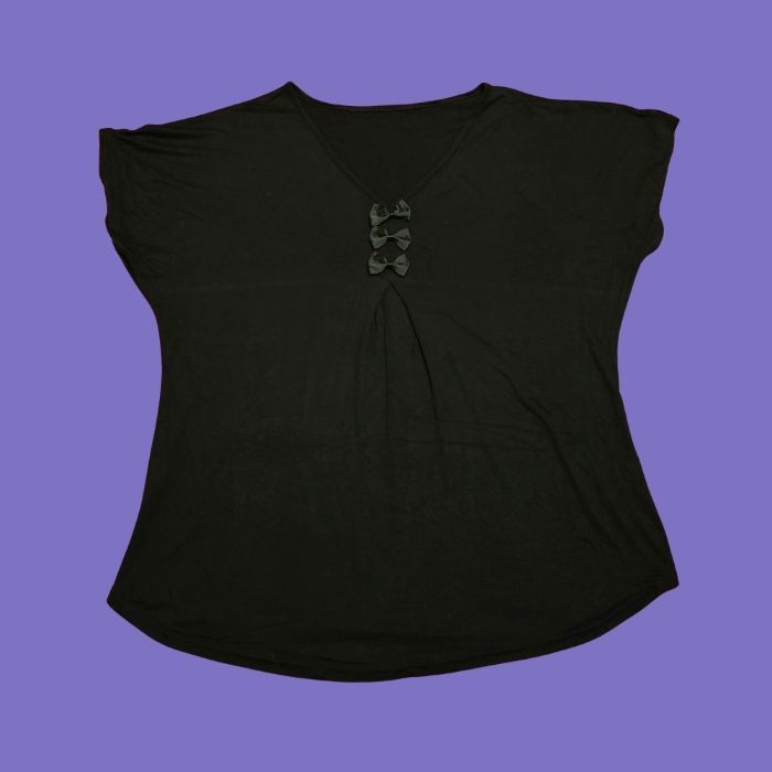 • 𝗦𝘁𝘆𝗹𝗲 : Tee-shirt, top fluide • 𝗖𝗼𝘂𝗹𝗲𝘂𝗿 : Noir • 𝗗𝗲𝗰𝗼𝗹𝗹𝗲𝘁𝗲 : En V • 𝗠𝗮𝗻𝗰𝗵𝗲𝘀 : Courtes (type chauve-souris) • 𝗗𝗲𝘁𝗮𝗶𝗹𝘀 : Trois petits nœuds décoratifs sur le devant • 𝗠𝗮𝘁𝗶𝗲𝗿𝗲 : 95% Viscose, 5% Élasthanne • 𝗙𝗮𝗯𝗿𝗶𝗰𝗮𝘁𝗶𝗼𝗻 : France • 𝗧𝗮𝗶𝗹𝗹𝗲 : Unique • 𝗘𝘁𝗮𝘁 : Bon état 📐 **𝗠𝗘𝗦𝗨𝗥𝗘𝗦** ▪︎ 𝐎𝐮𝐯𝐞𝐫𝐭𝐮𝐫𝐞 𝐝𝐮 𝐜𝐨𝐮 : 25 cm ▪︎ 𝐀𝐢𝐬𝐬𝐞𝐥𝐥𝐞𝐬 : 54 cm ▪︎ 𝐓𝐨𝐮𝐫 𝐝𝐞 𝐭𝐚𝐢𝐥𝐥𝐞 : 50 cm ▪︎ 𝐋𝐨𝐧𝐠𝐮𝐞𝐮𝐫 𝐭𝐨𝐭𝐚𝐥𝐞 : 63 cm ▪︎ 𝐋𝐚𝐫𝐠𝐞𝐮𝐫 𝐝𝐞 𝐜𝐞𝐢𝐧𝐭𝐮𝐫𝐞 : 56 cm
