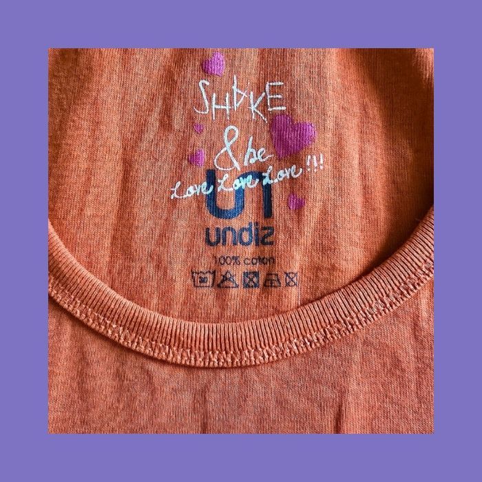 • 𝗠𝗮𝗿𝗾𝘂𝗲 : Undiz • 𝗧𝘆𝗽𝗲 : Débardeur • 𝗖𝗼𝘂𝗹𝗲𝘂𝗿 : Orange corail • 𝗠𝗼𝘁𝗶𝗳 : Message "Shake & Be Love Love Love !!!" avec cœurs • 𝗠𝗮𝘁𝗶𝗲𝗿𝗲 : 100% Coton • 𝗧𝗮𝗶𝗹𝗹𝗲 : 38 (M) • 𝗘𝘁𝗮𝘁 : Très bon état